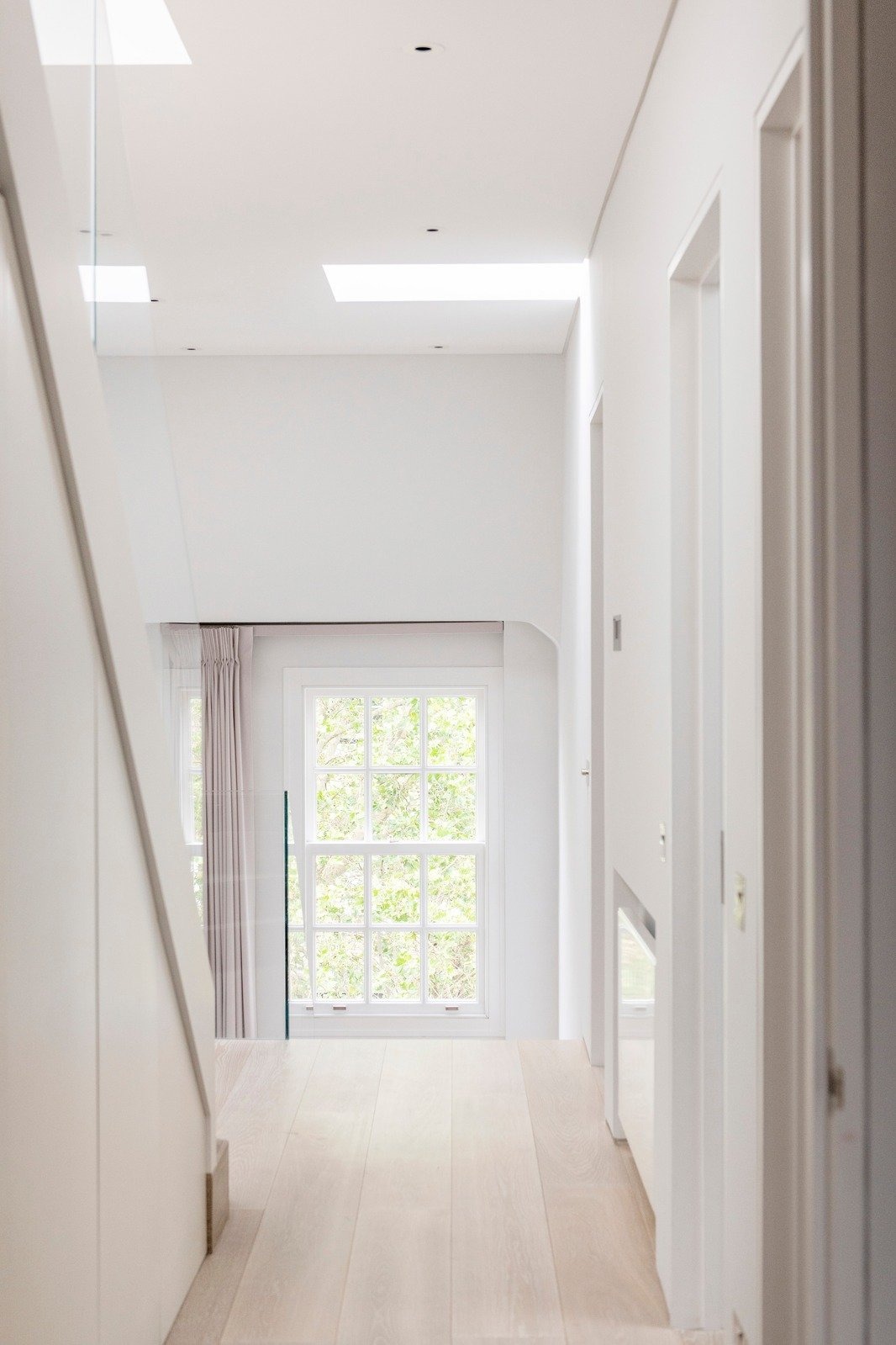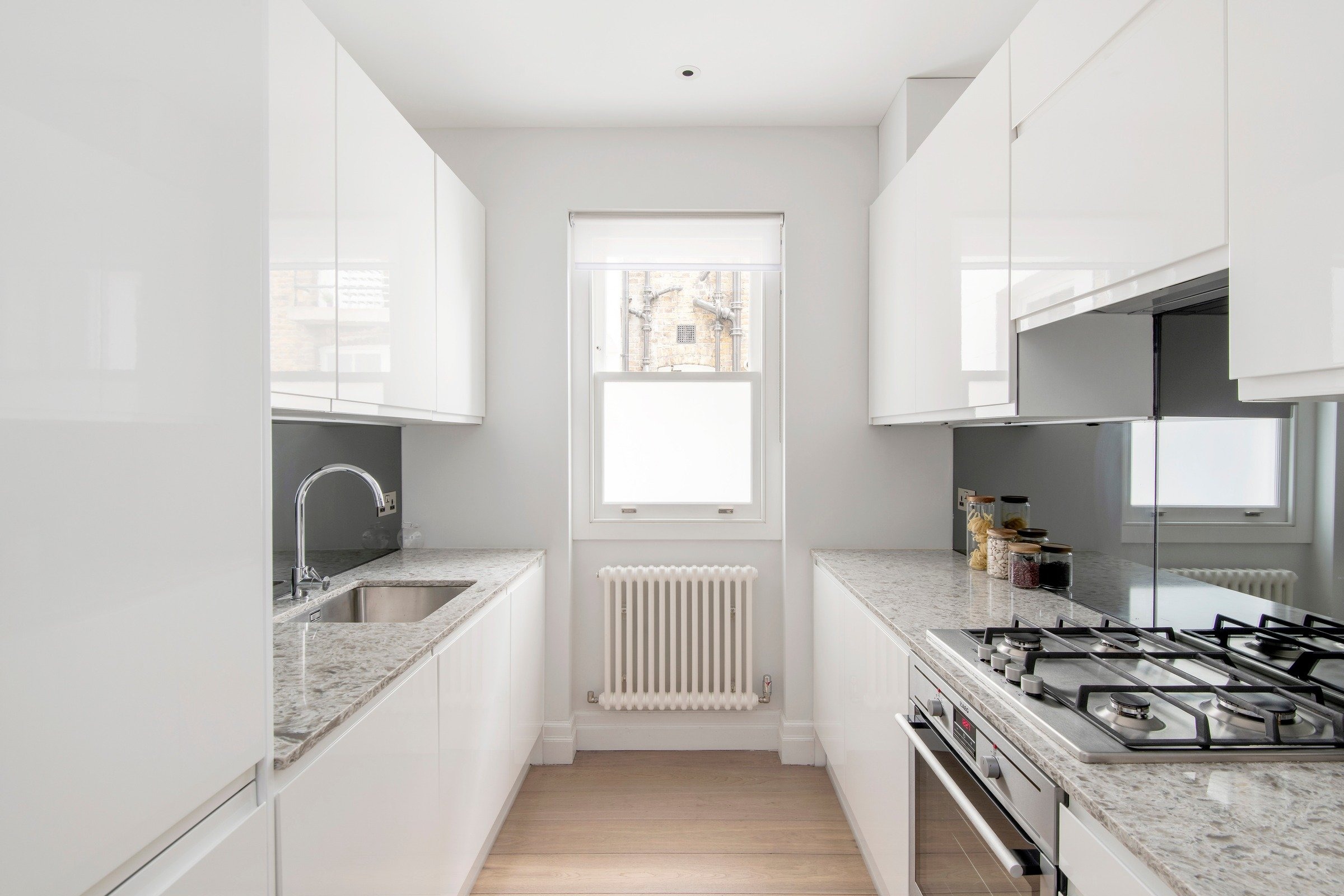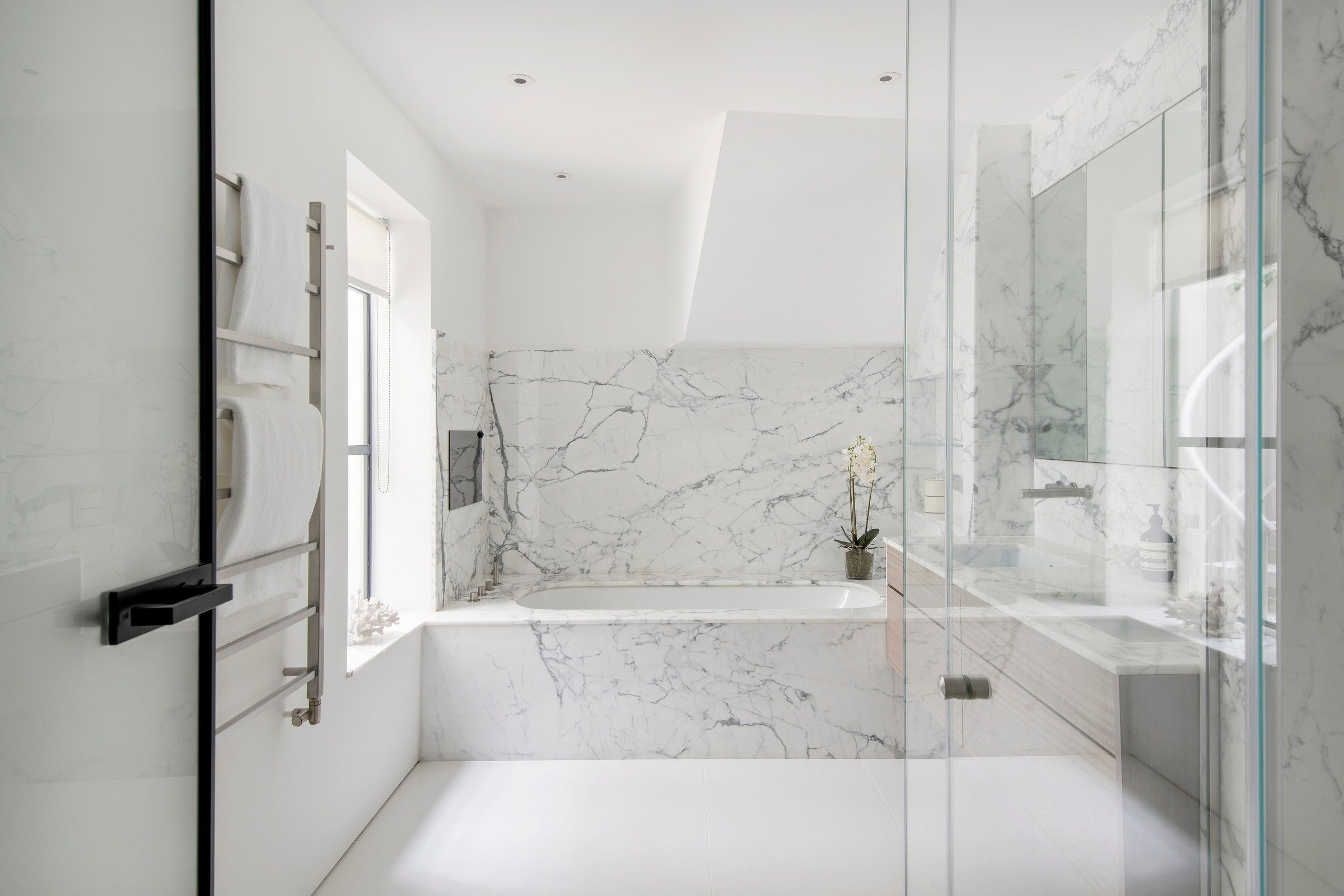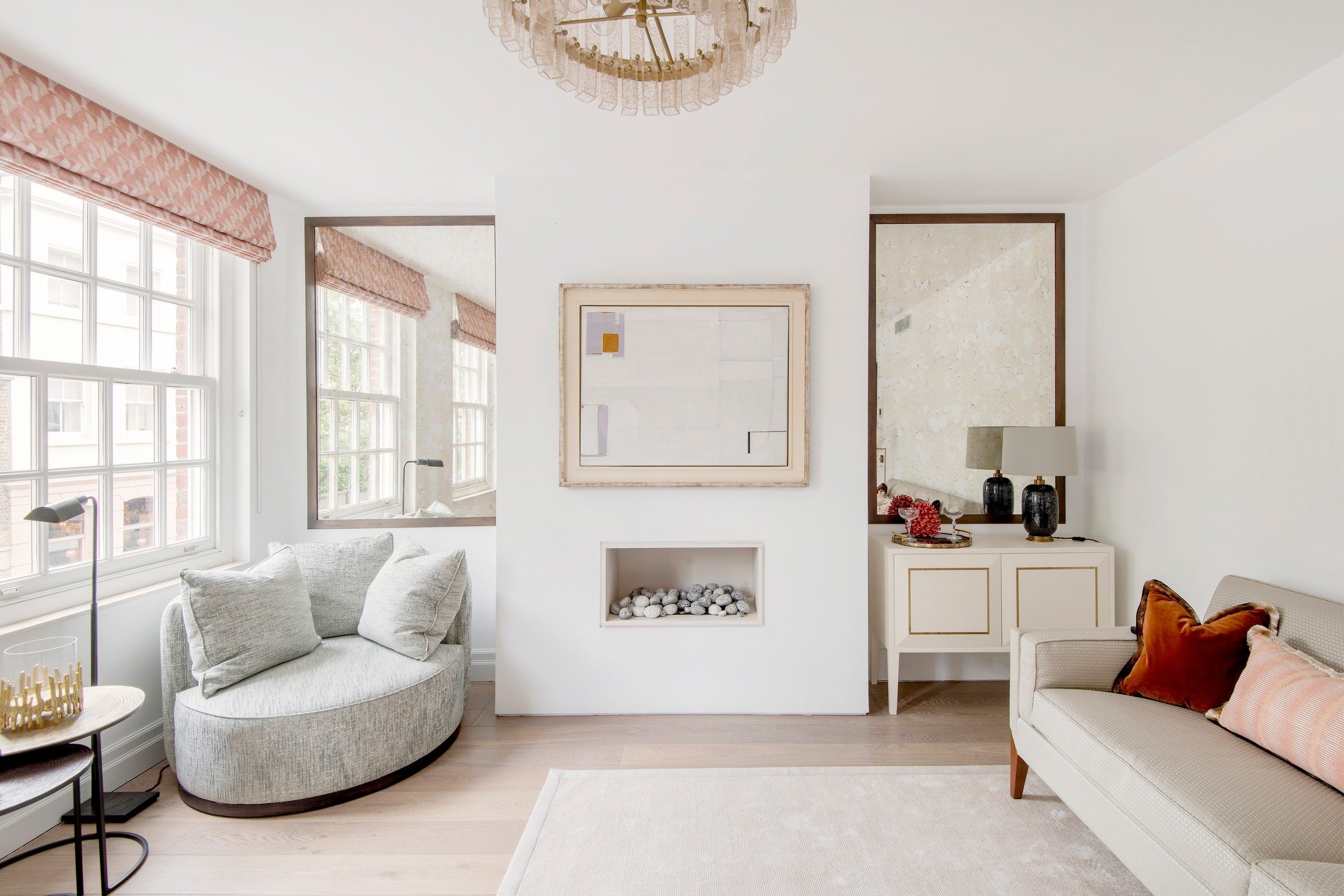 This five-storey Chelsea townhouse was transformed into three luxury apartments, blending a traditional façade with contemporary, high-end interiors. The lower ground apartment features an internal terrace linking the master suite to adjoining guest rooms, a walk-in dressing room, and a dramatic marble-clad bathroom, along with a high-ceilinged reception anchored by a minimal remote-controlled fireplace and an open-plan kitchen with a sociable bar area. The first-floor apartment was designed for entertaining, with a full-height fireplace, decorative pendant lighting, and modern furnishings, while bedrooms feature ensuite marble or ceramic bathrooms and fitted gloss wardrobes. The top-floor apartment benefits from private roof access, reimagined as a stylish low-maintenance terrace with faux decking and planting, complemented by an aubergine-accented master suite and individually styled guest rooms, each with its own distinctive palette and character.