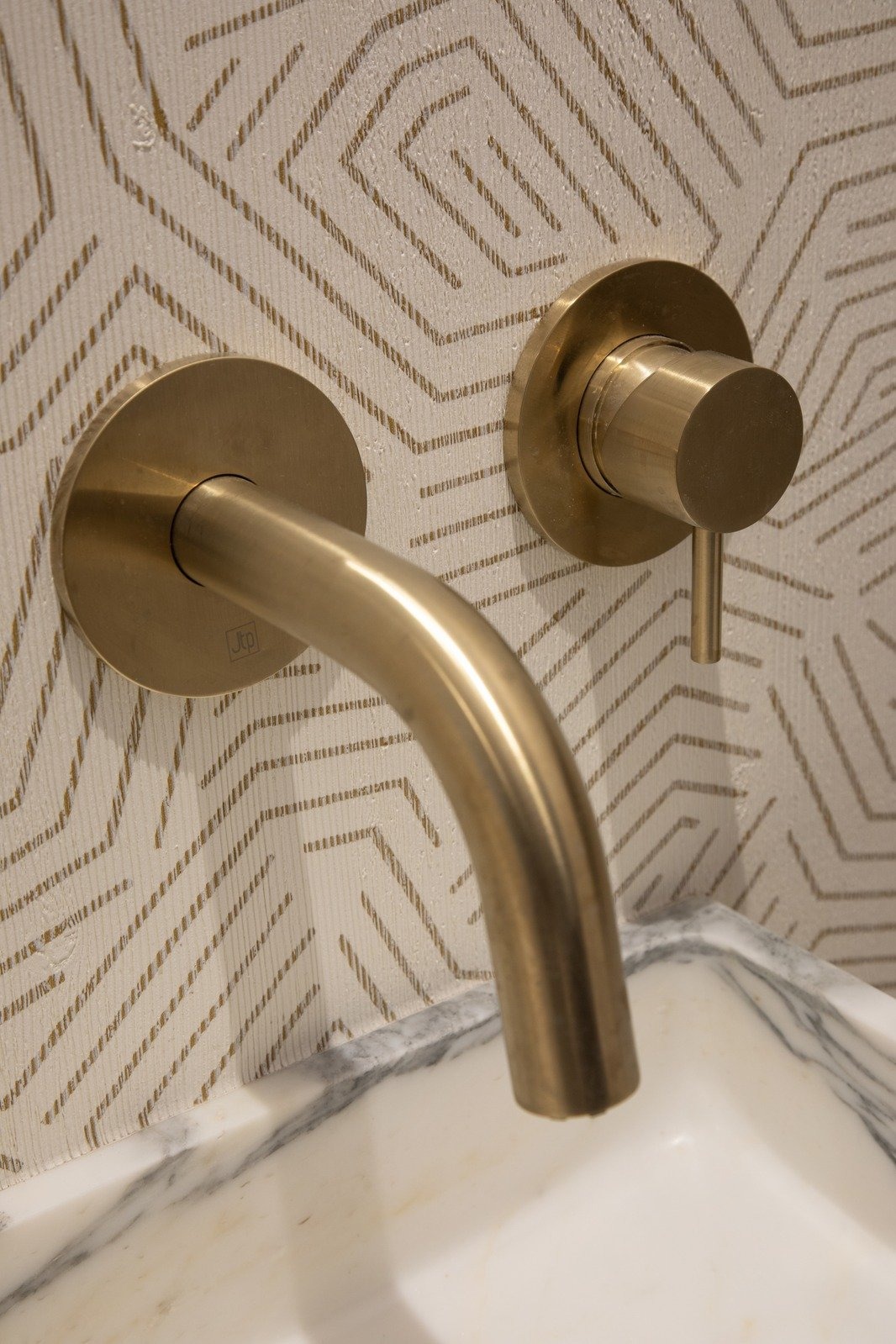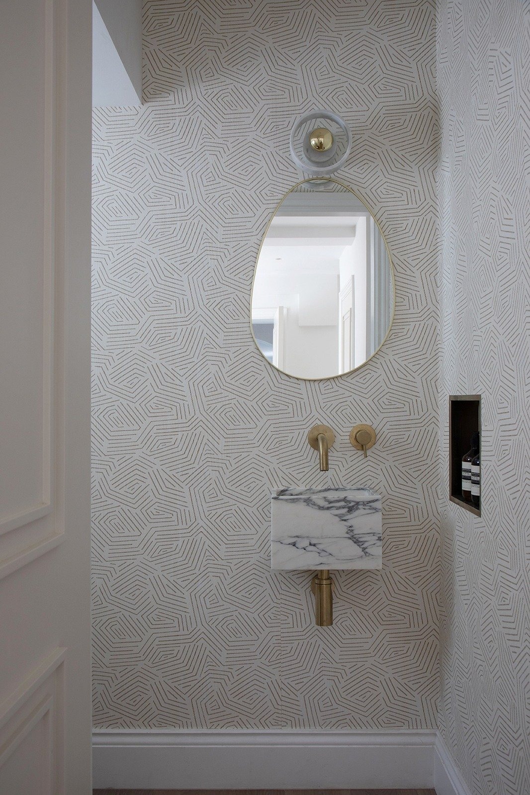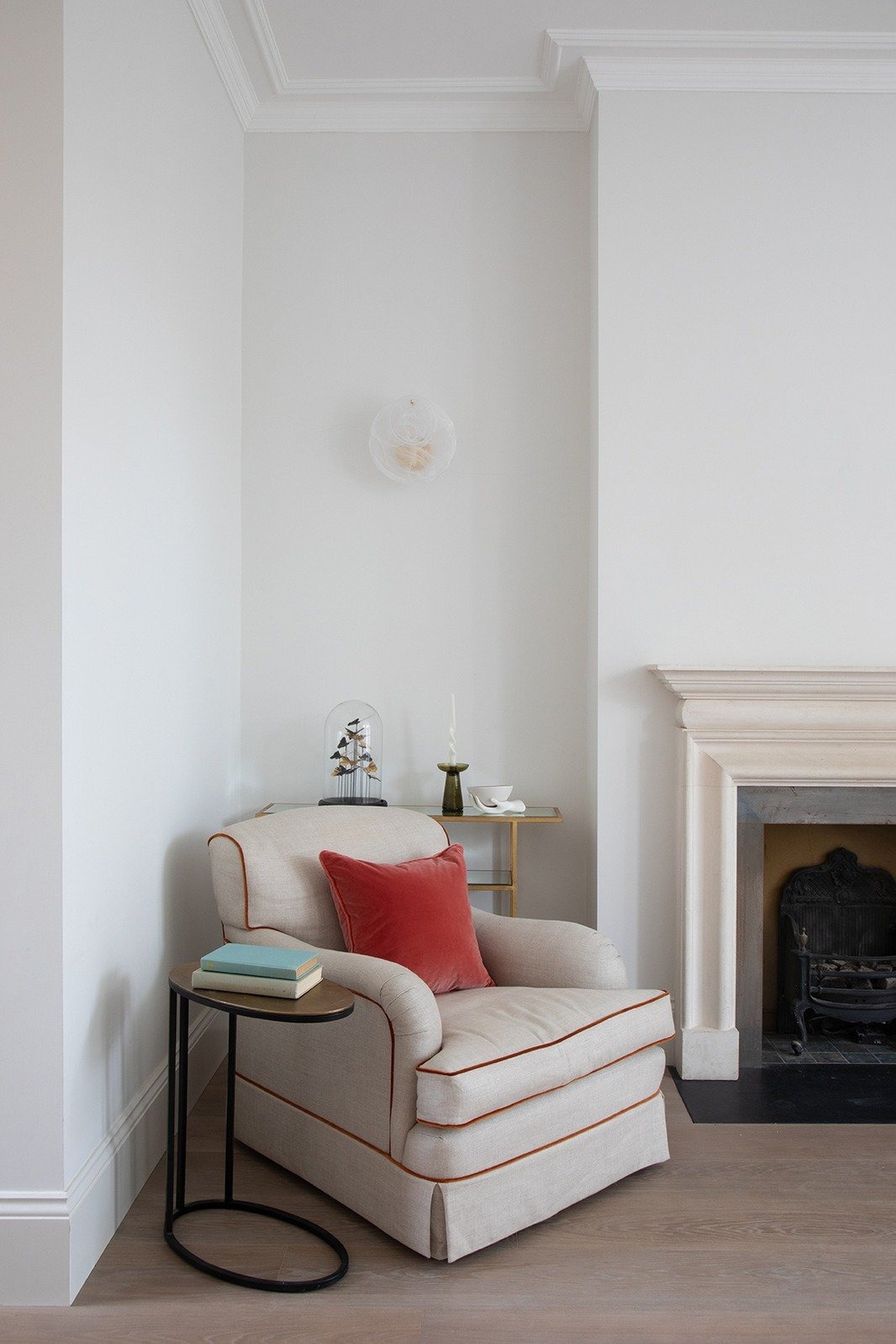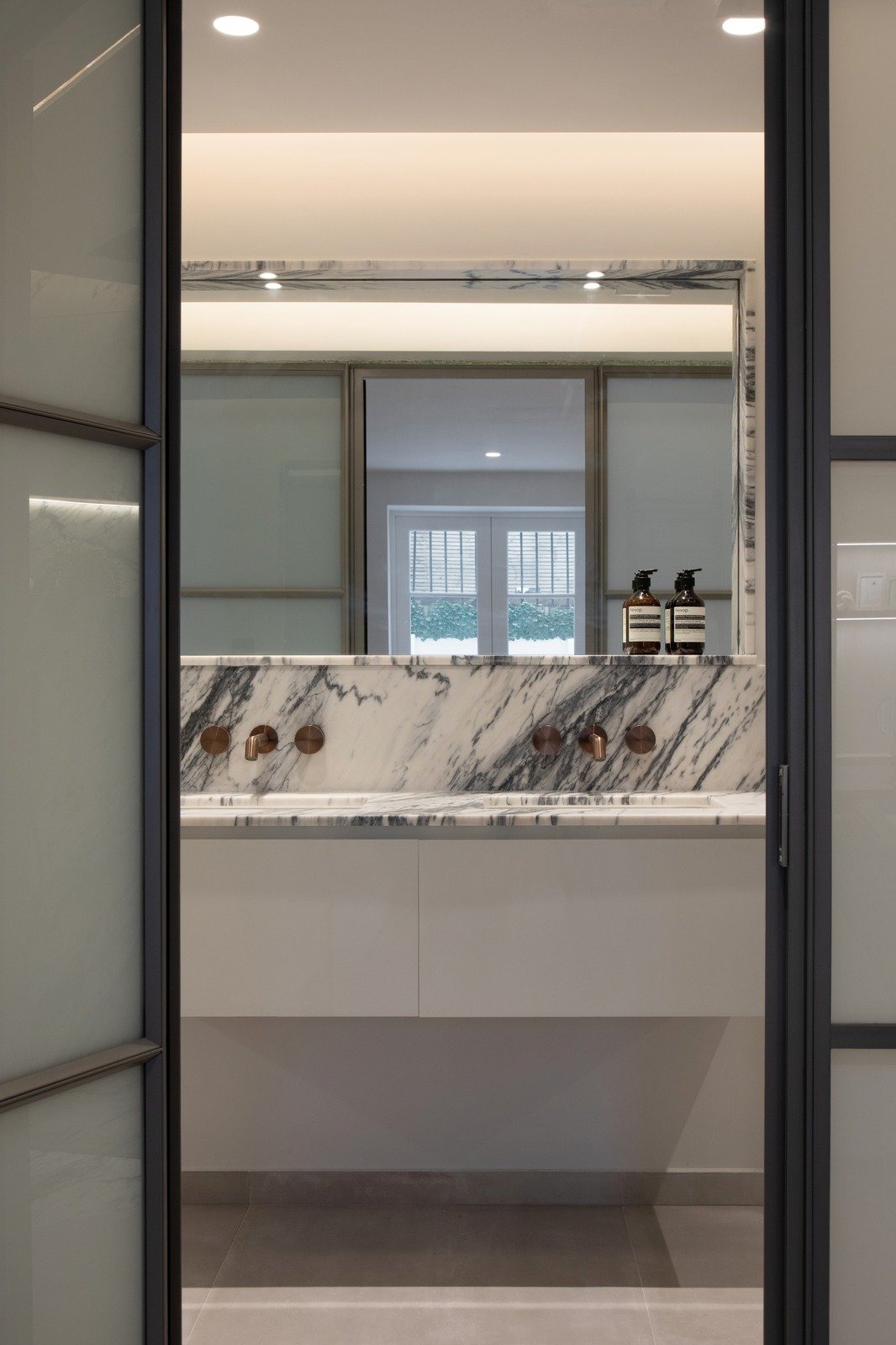 This ground and lower ground floor Chelsea apartment underwent a full renovation and reconfiguration to create a turnkey home ready for market. Tall Victorian sash windows and new architectural detailing, including decorative plaster cornices, ceiling roses, and a limestone fireplace, set an elegant tone for the double reception. A rear extension introduced a high-end Italian kitchen with soft grey veneer units, a cantilevered bar, and full-height doors opening to the garden. The lower ground was redesigned to maximise space and light, featuring a master suite with high-gloss wardrobes, a marble ensuite behind bespoke bronze Crittall doors, and an adjoining dressing room with a built-in desk. Two guest bedrooms with sage and coral accents, a geometric wallpapered WC, and a unique polished plaster family bathroom completed the layout. With layered finishes, bespoke details, and a seamless flow between inside and out, the apartment is a light-filled and stylish Chelsea retreat.