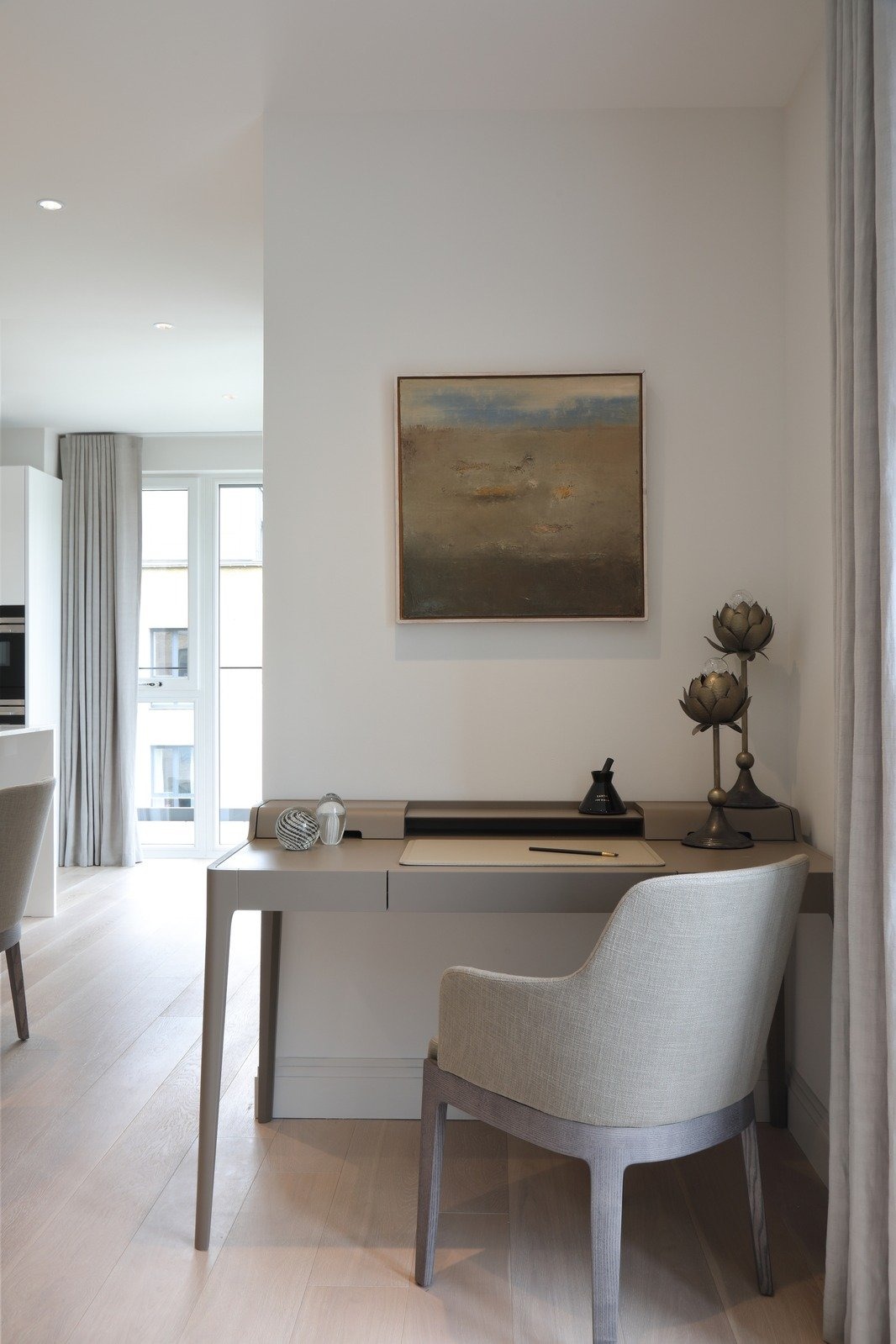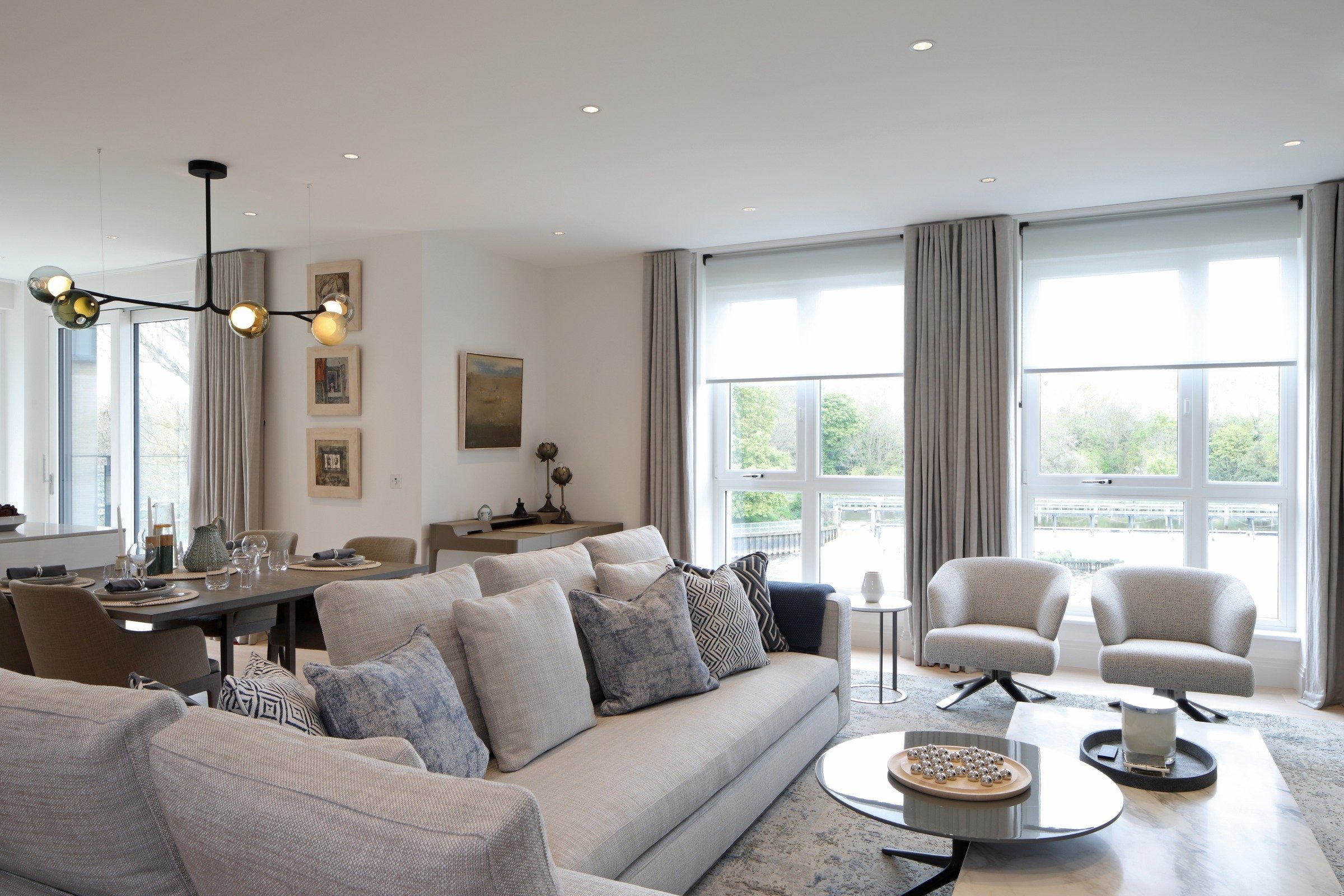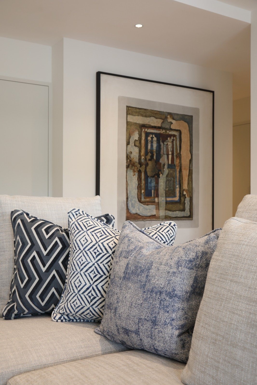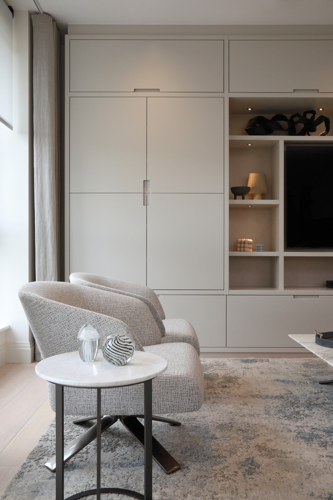 This modern riverside apartment, with panoramic views of Teddington Lock, was designed as a London base for an international family to gather throughout the year. The brief was to create a light-filled and tranquil retreat, inspired by its waterside setting, with a palette of warm greys, taupe, and soft blues. The open-plan living space features layered textural fabrics, a Poliform Mondrian coffee table in Carrara marble and lacquer, and a custom Stark rug hand-knotted to the perfect shade. Bespoke joinery plays a key role, including a wall-to-wall TV unit by Ecoism with open shelving for objets and concealed storage. Throughout, the clients’ eclectic artwork collection anchors the design, ensuring each room balances sophistication with warmth and a sense of home.
