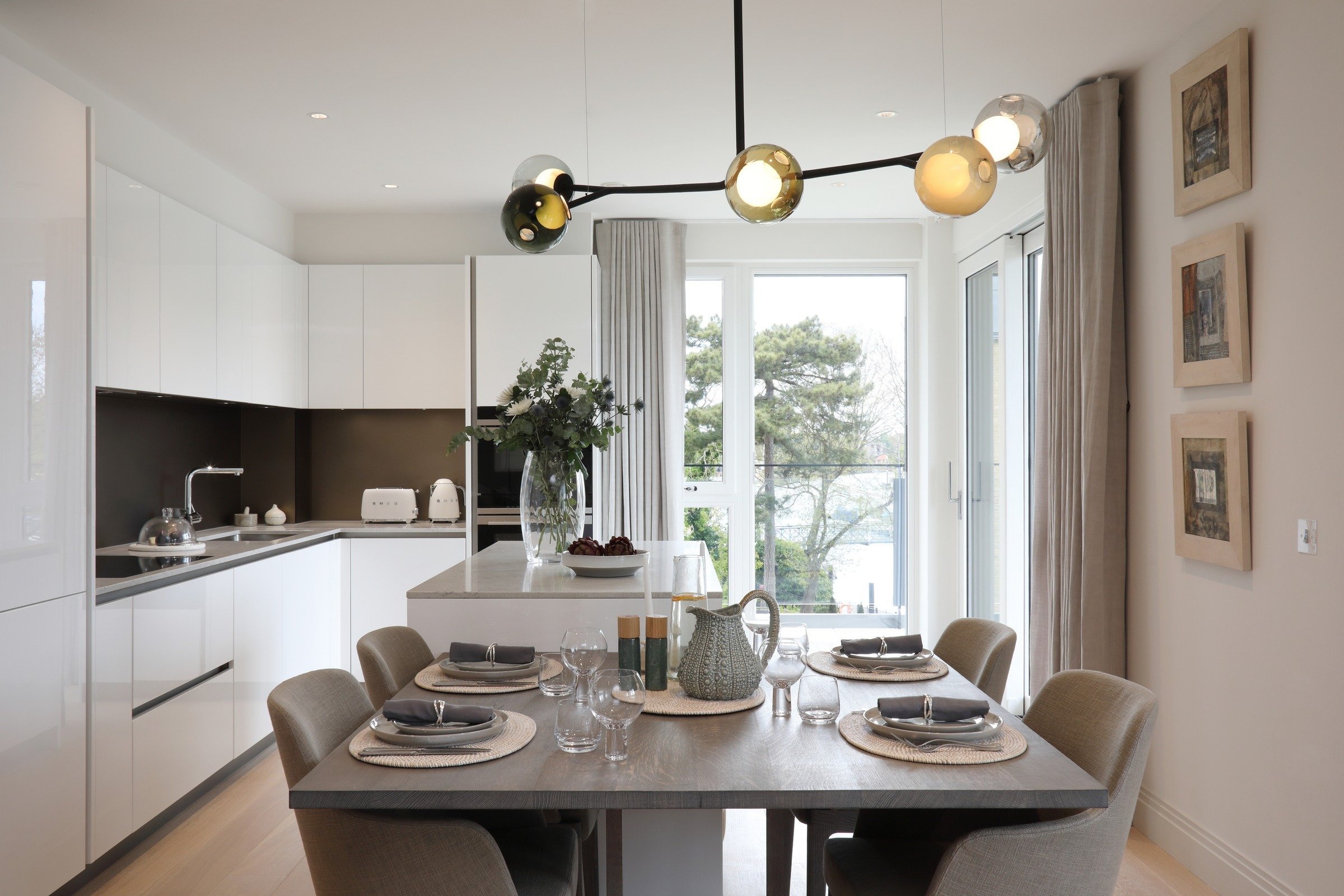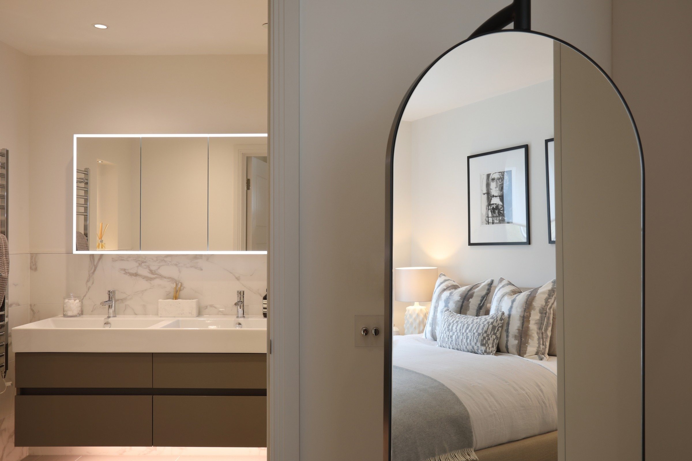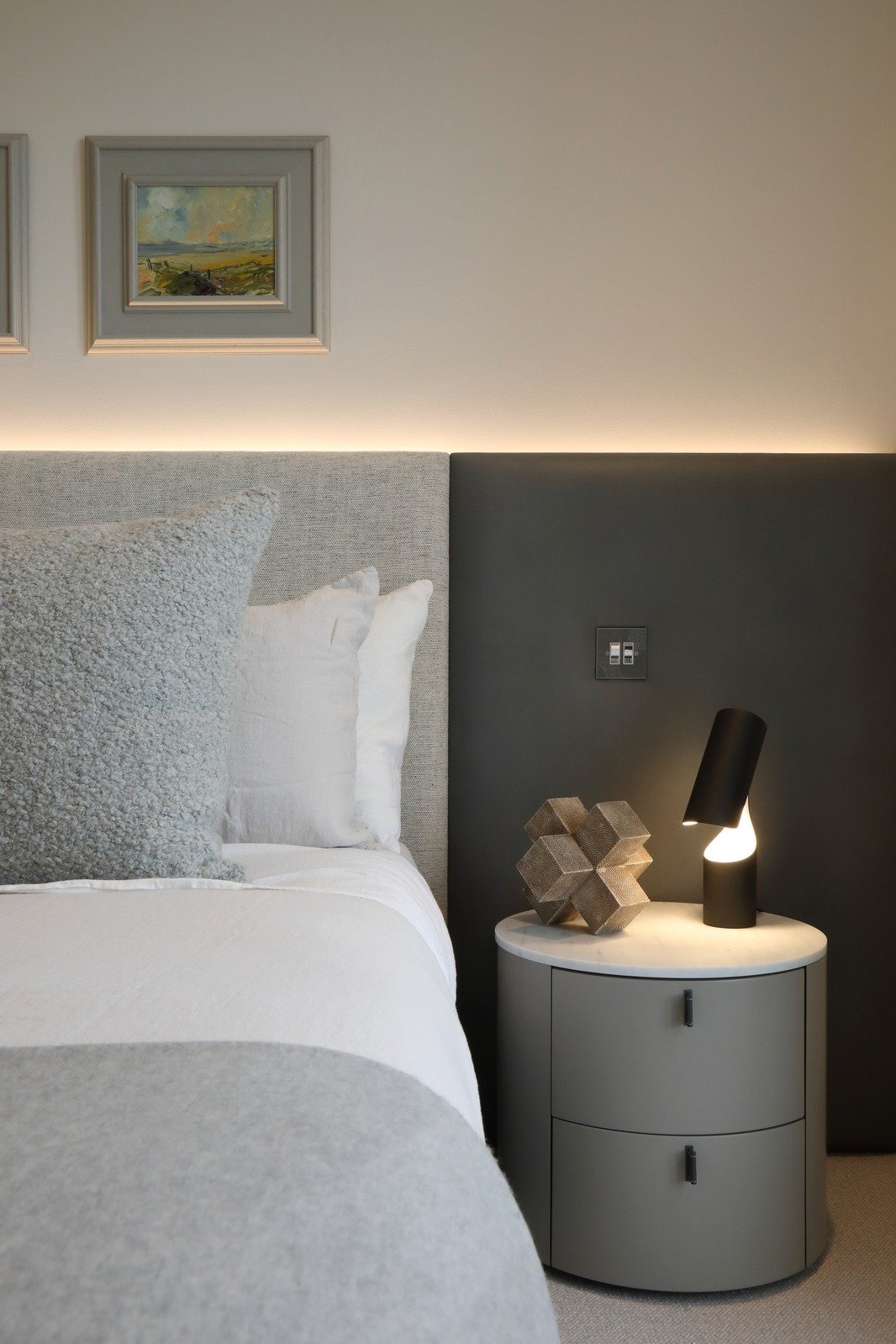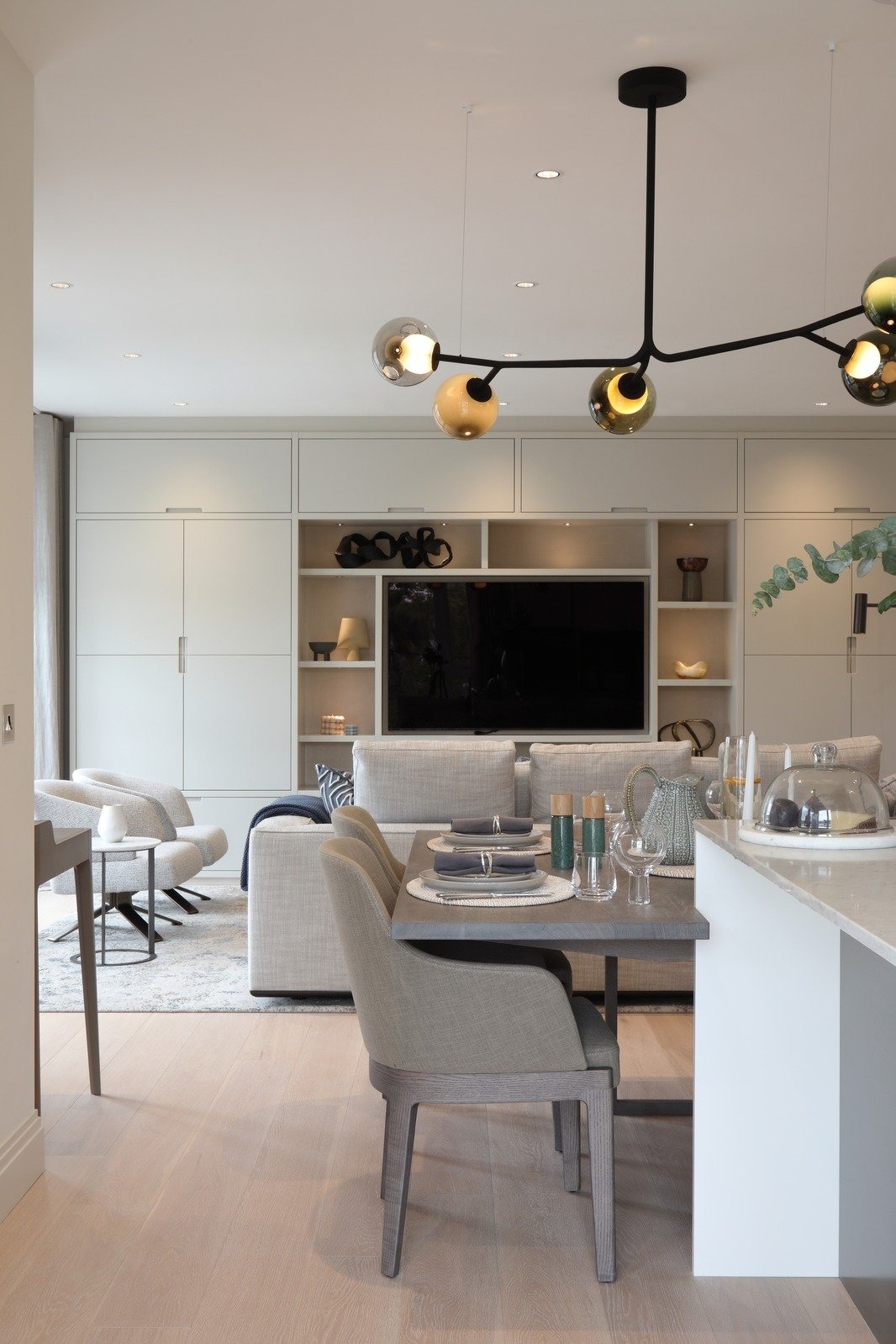 This modern riverside apartment, with panoramic views of Teddington Lock, was designed as a London base for an international family to gather throughout the year. The brief was to create a light-filled and tranquil retreat, inspired by its waterside setting, with a palette of warm greys, taupe, and soft blues. The open-plan living space features layered textural fabrics, a Poliform Mondrian coffee table in Carrara marble and lacquer, and a custom Stark rug hand-knotted to the perfect shade. Bespoke joinery plays a key role, including a wall-to-wall TV unit by Ecoism with open shelving for objets and concealed storage. Throughout, the clients’ eclectic artwork collection anchors the design, ensuring each room balances sophistication with warmth and a sense of home.