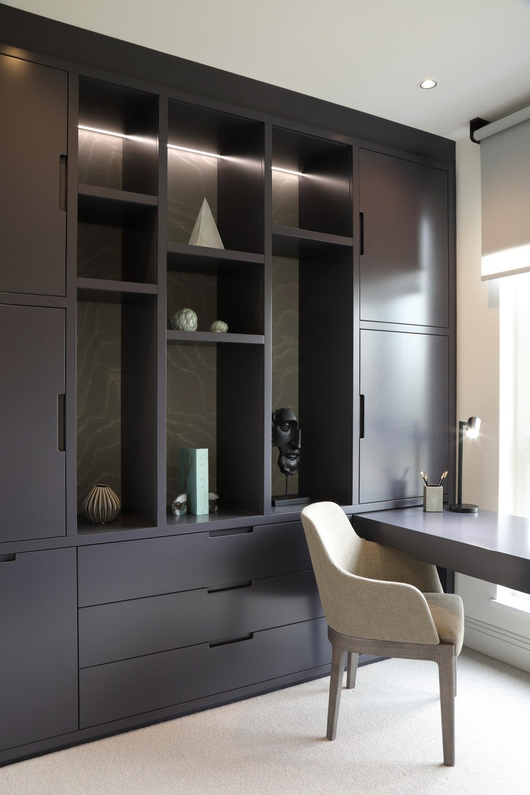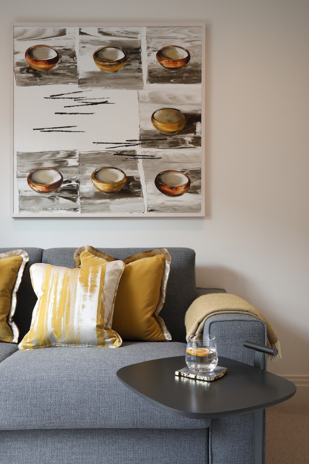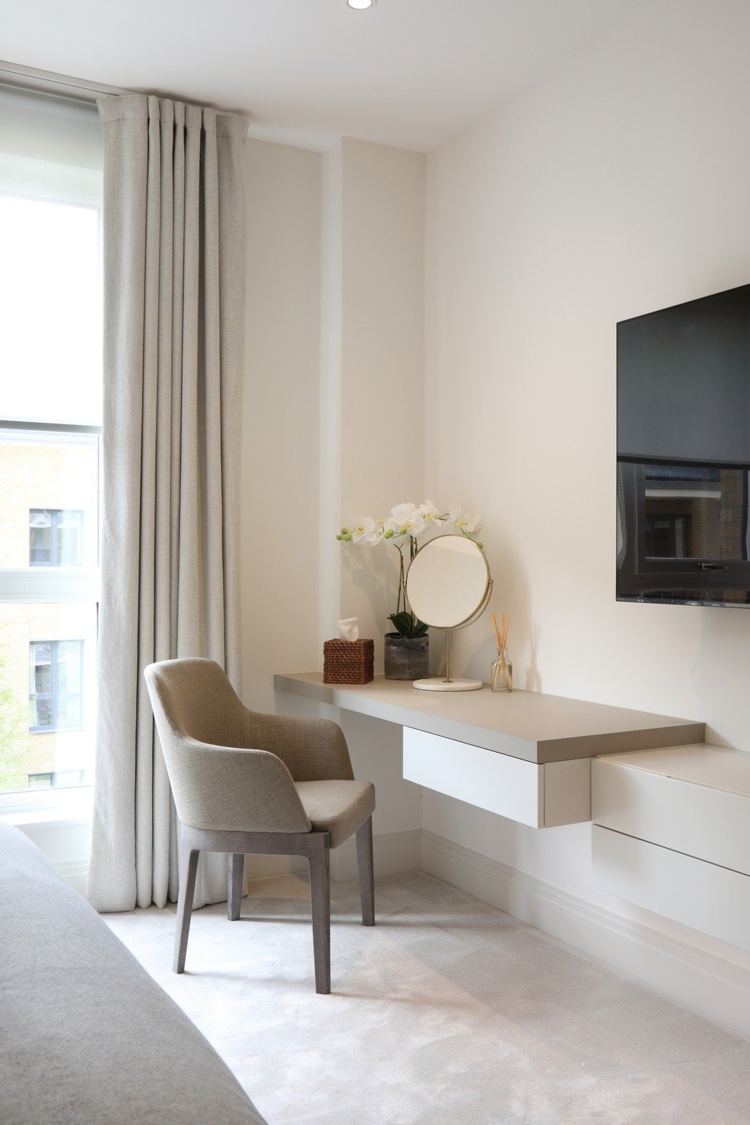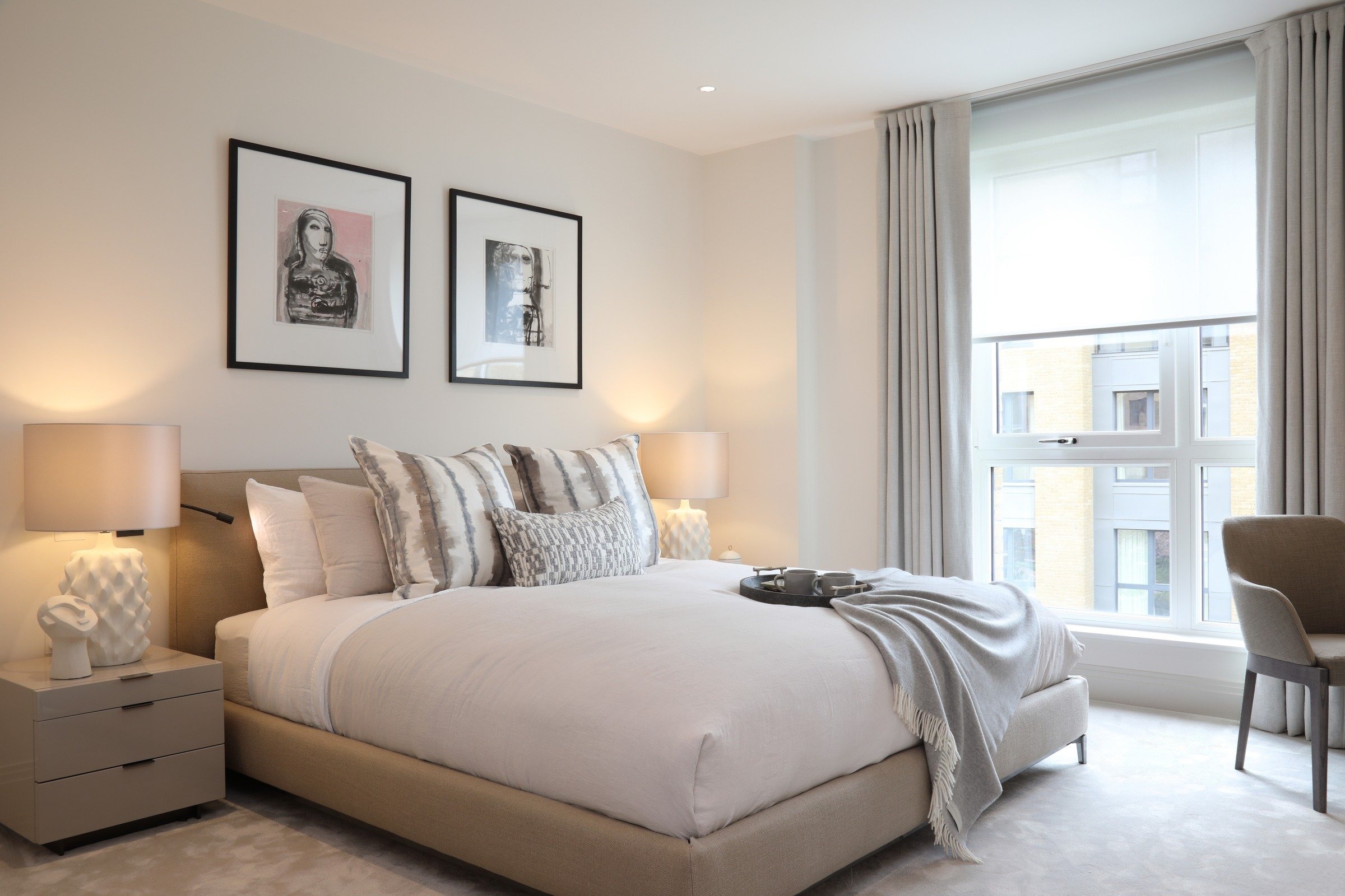 This modern riverside apartment, with panoramic views of Teddington Lock, was designed as a London base for an international family to gather throughout the year. The brief was to create a light-filled and tranquil retreat, inspired by its waterside setting, with a palette of warm greys, taupe, and soft blues. The open-plan living space features layered textural fabrics, a Poliform Mondrian coffee table in Carrara marble and lacquer, and a custom Stark rug hand-knotted to the perfect shade. Bespoke joinery plays a key role, including a wall-to-wall TV unit by Ecoism with open shelving for objets and concealed storage. Throughout, the clients’ eclectic artwork collection anchors the design, ensuring each room balances sophistication with warmth and a sense of home.