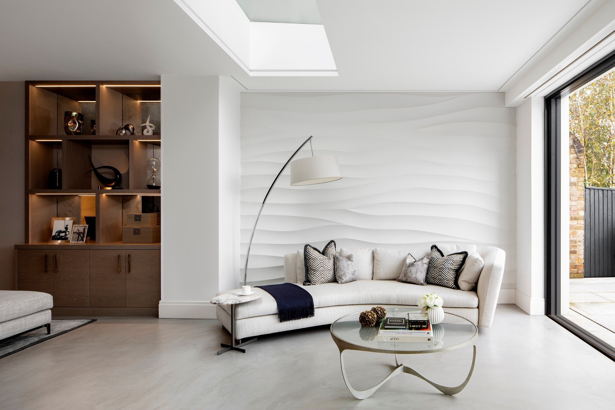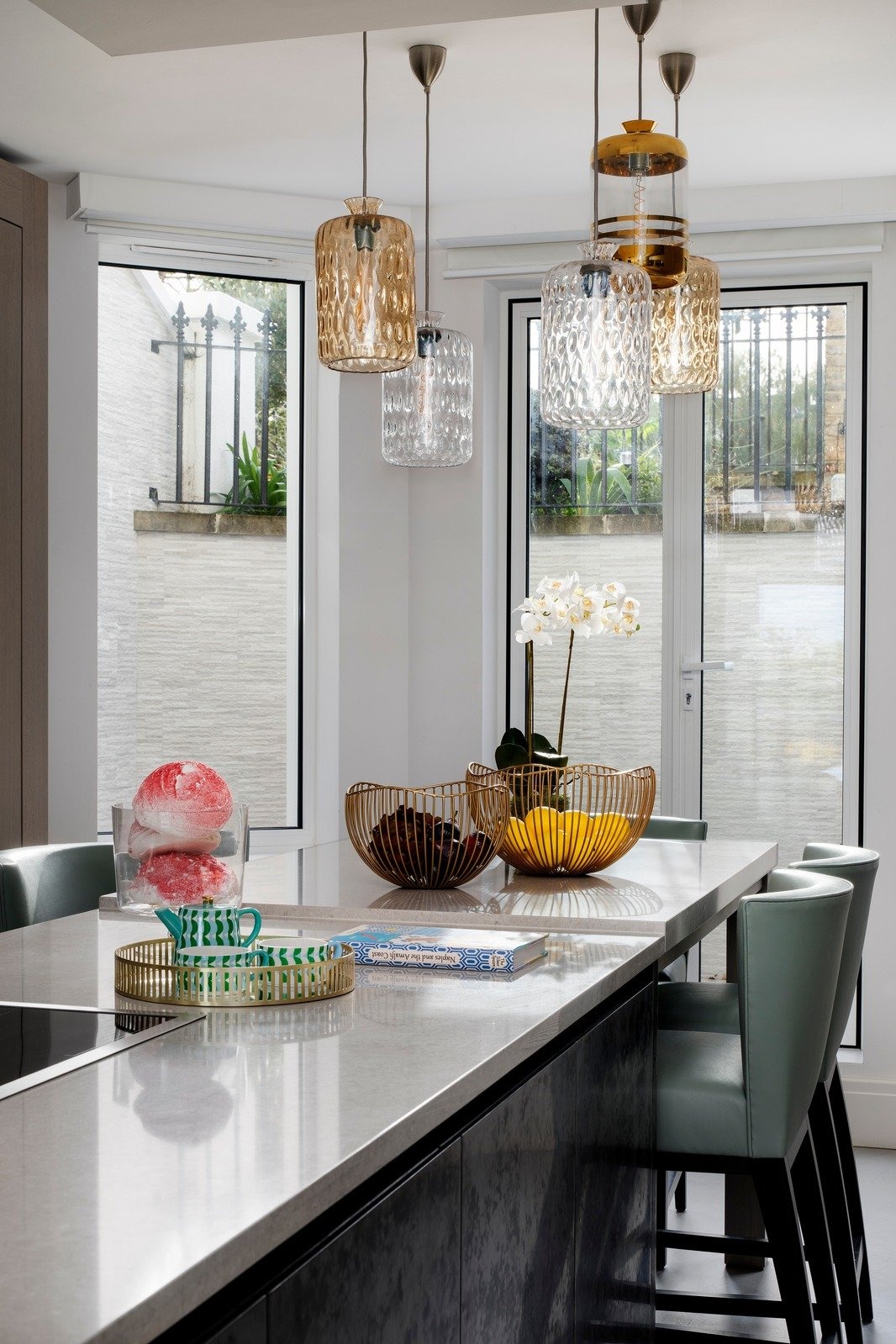 This 18th-century family home in Greenwich was reimagined with a focus on space planning and style, working alongside a local architect to create a contemporary lower ground floor with five distinct areas, including a new open-plan kitchen, dining room, family snug, study, and dog room leading to landscaped gardens with Canary Wharf views. A glass extension with roof lights and sliding doors maximises light, while a textured Armourcoat feature wall adds drama and tranquillity. In the dining room, a full-height antique mirror, B&B Italia circular dining set, bespoke rugs from the Juliette Byrne x Matthew Wailes collection, and a bronze Cameron Design pendant create a sophisticated atmosphere. The drawing room pairs a curved Minotti sofa in Chanel-style tweed with Oficina Inglesa armchairs beneath Bella Figura chandeliers, bringing elegance and structure. The master bedroom was designed as a serene retreat, with a faux leather upholstered feature wall, Romo textured wallpaper, and layers of neutral tones accented with navy and blue. Robert Langford furnishings, Abbott & Boyd velvet, and William Yeoward patterned fabric enhance the sense of comfort, framed by Chase Erwin curtains that capture views over the garden and beyond.