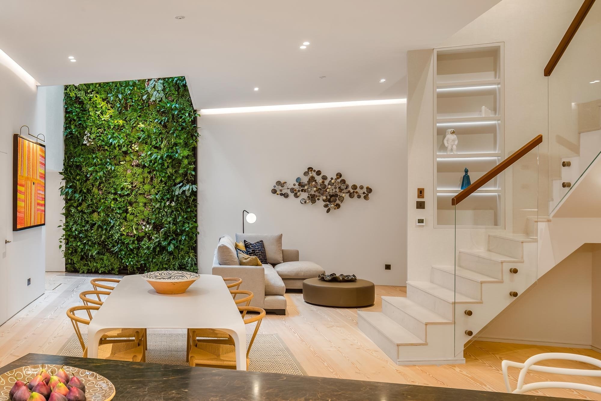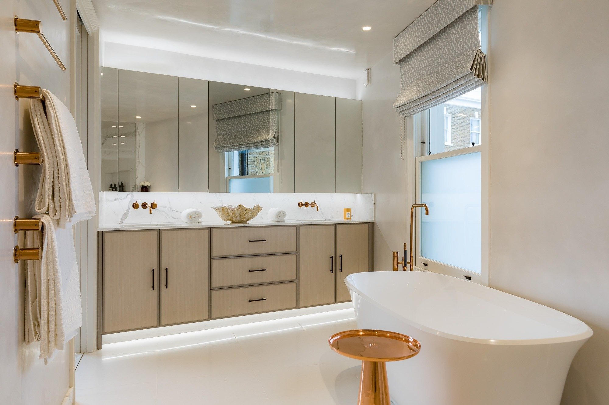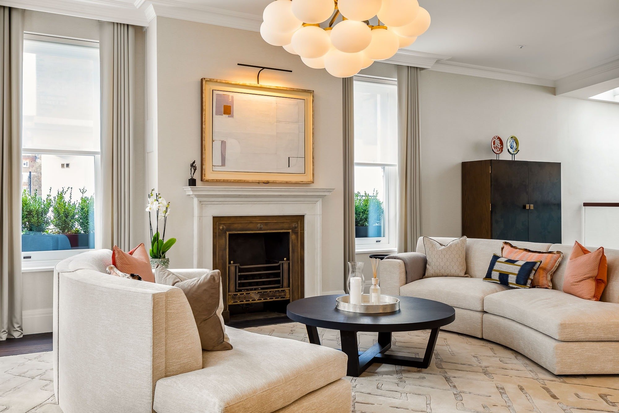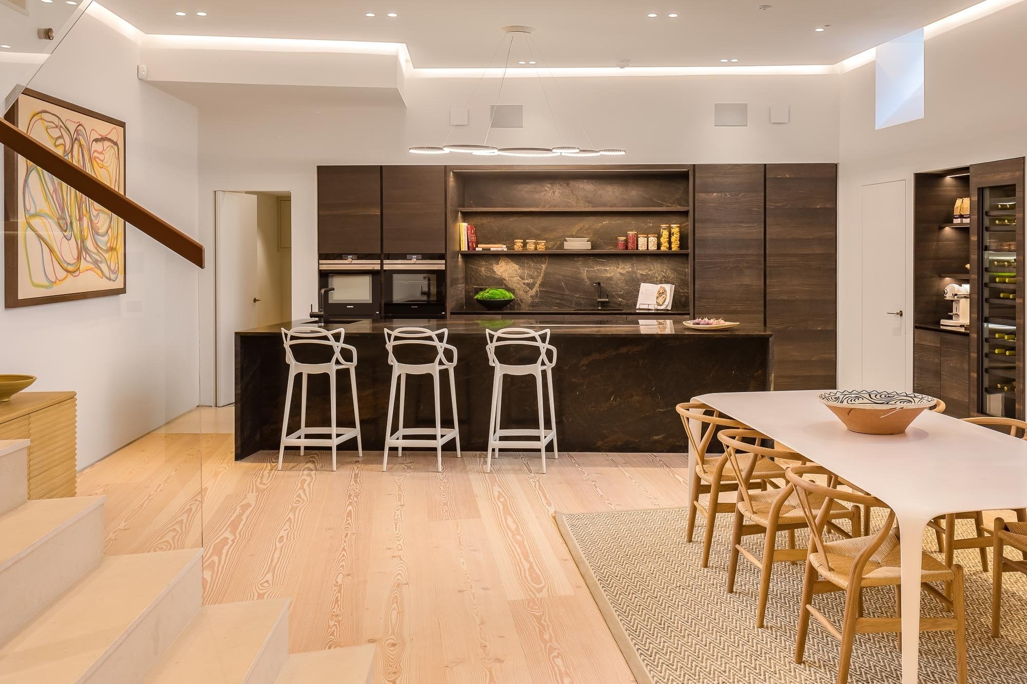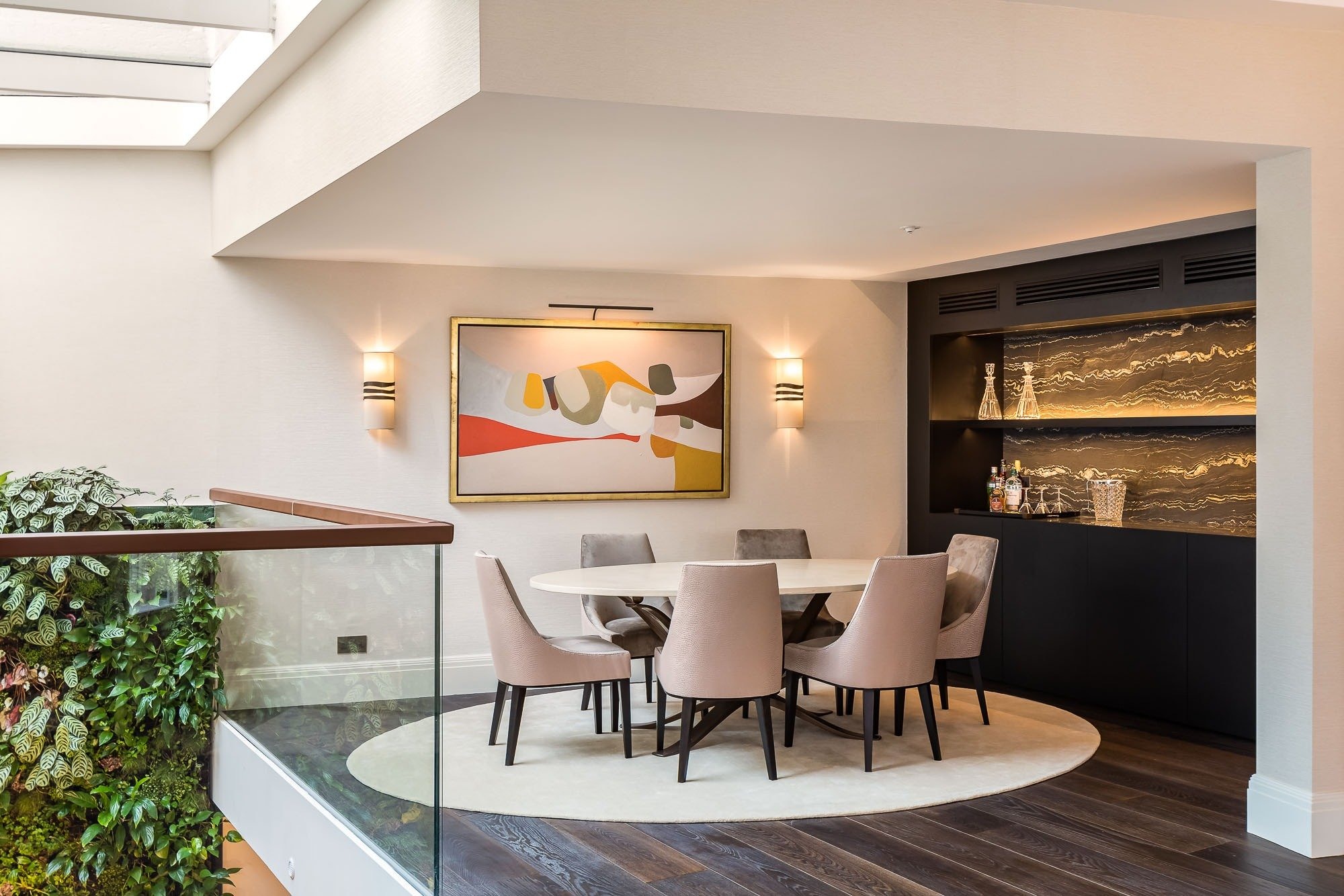 This newly built period-style townhouse in the heart of Chelsea spans five storeys, offering five bedrooms, two living rooms, two dining areas, two home offices, terraces, a walk-in wine store, and more. Originally the site of a disused launderette, it was reimagined as a bright and luxurious home for a stylish family who loves to entertain. Inspired by the client’s eclectic art collection, we developed vibrant schemes with coral, orange, and ochre accents set against neutral backdrops to maximise light and showcase their pieces. Dramatic dark marble adds striking contrast throughout, most notably in bespoke bar cabinetry and the lower-ground kitchen, with each slab hand-selected and enhanced by integrated LED lighting. Abundant wine storage, including a walk-in room and cooler, ensures the home is perfectly equipped for hosting gatherings, while layered design details create a residence that is both contemporary and characterful.