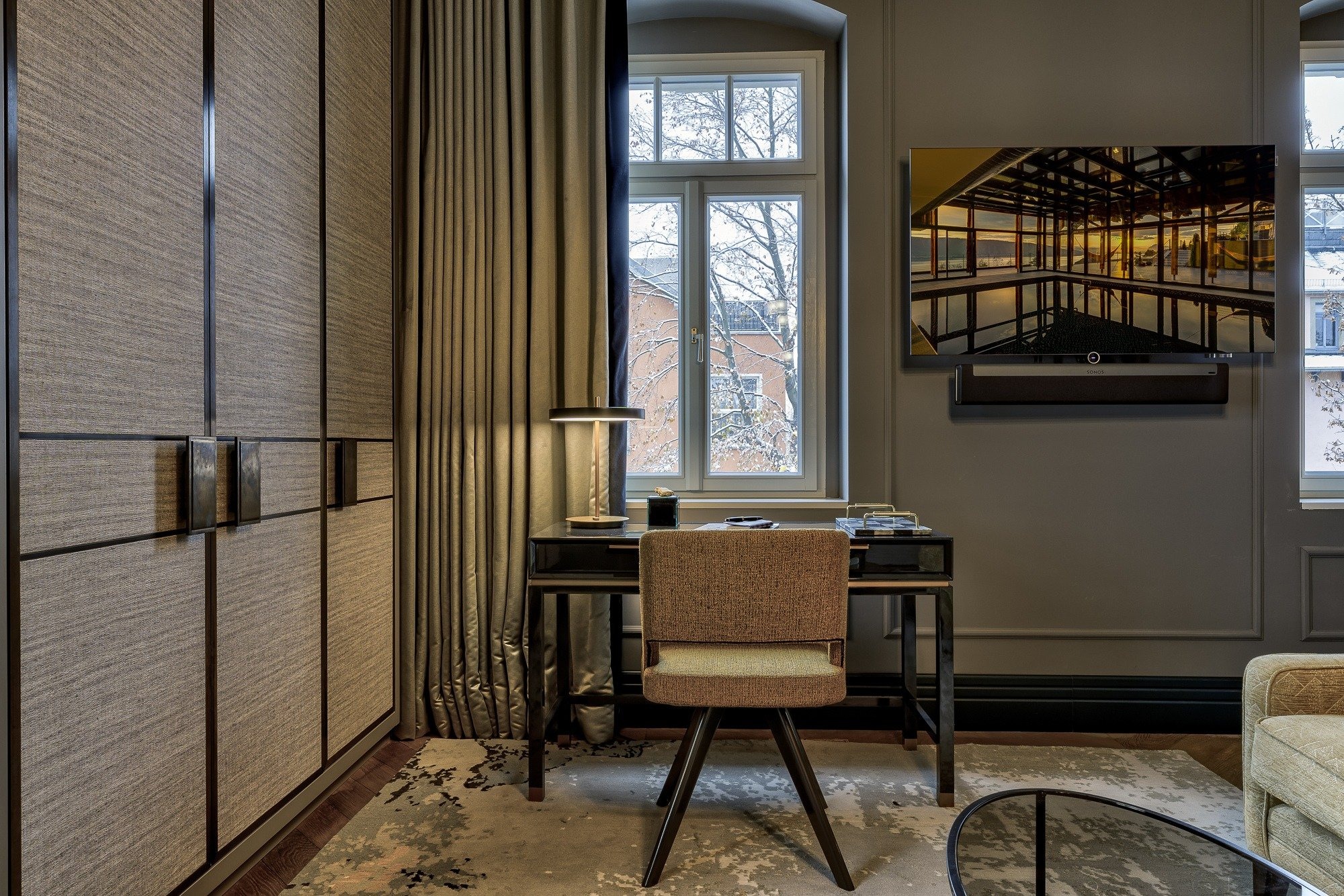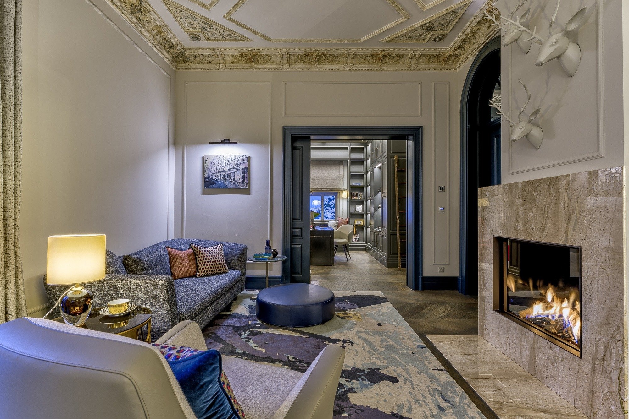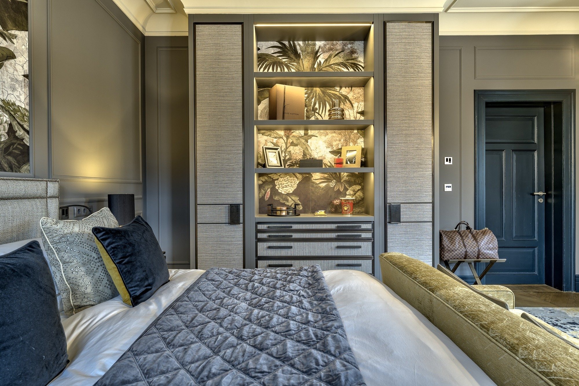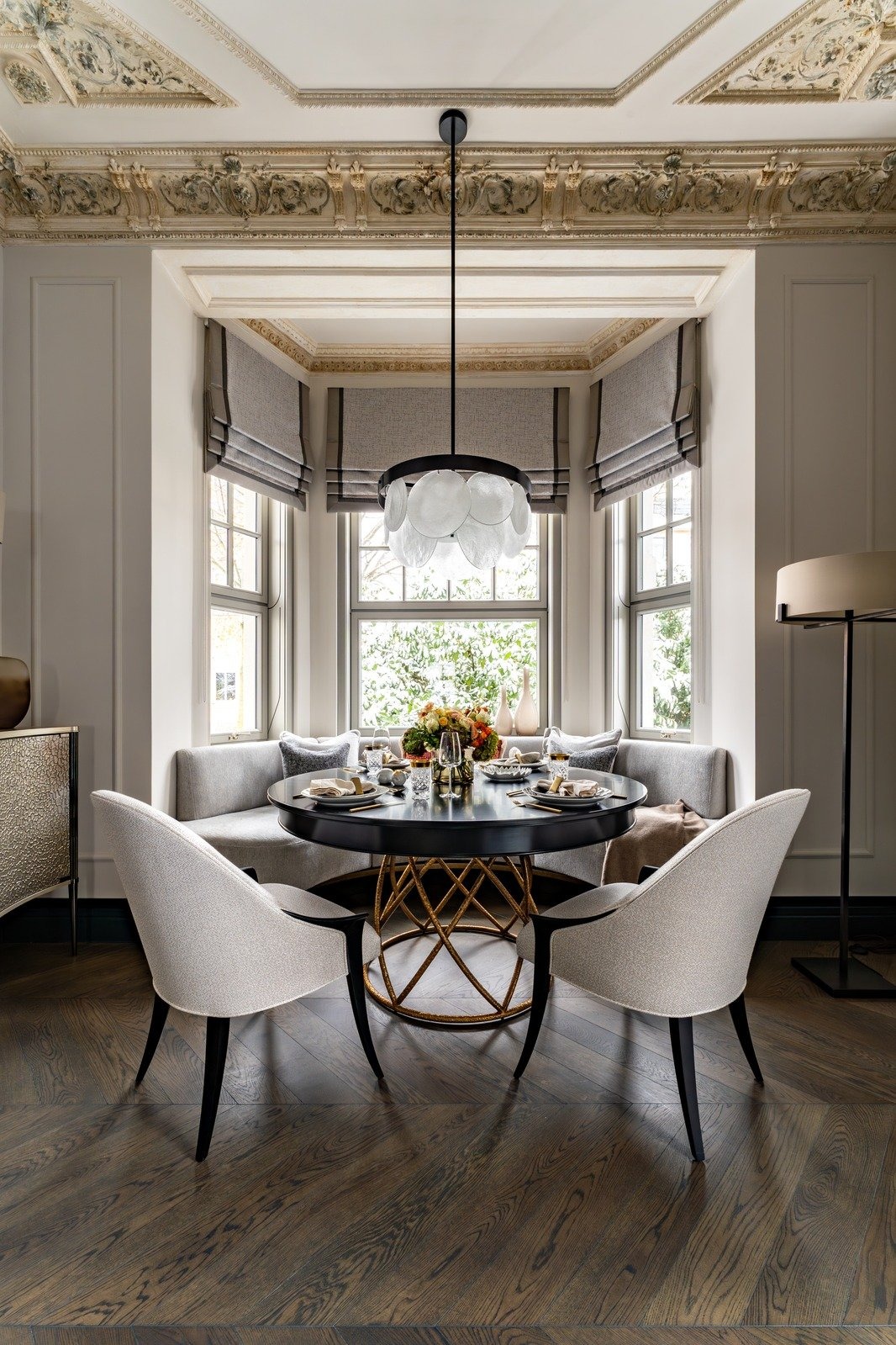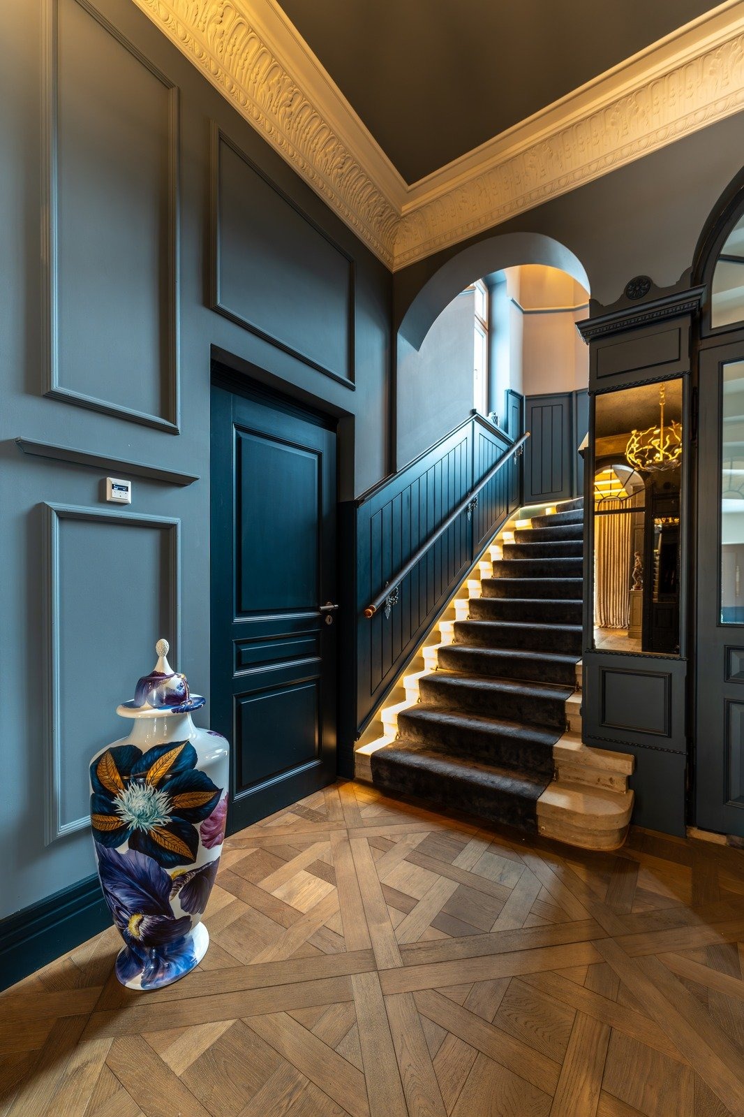 This German Merchant Townhouse was transformed from its divided past into a singular vision of elegance, harmonising traditional grace with contemporary living. Respecting the original architecture, we restored decorative plaster cornices, the stone staircase, and panelling with the help of local artisans, while integrating modern lighting and heating throughout. Strategic layout changes included arched glazed panels above entrance doors and a side extension housing a practical yet elegant boot room. Design highlights feature a marble-clad chimney breast with remote-controlled fire in the formal seating area, a bespoke study/library, and a dining area with a bay-window banquette. Bespoke joinery, from the kitchen’s Belfast sink to illuminated display cabinets, reinforces the home’s unique character and exemplifies the seamless blend of old and new.
