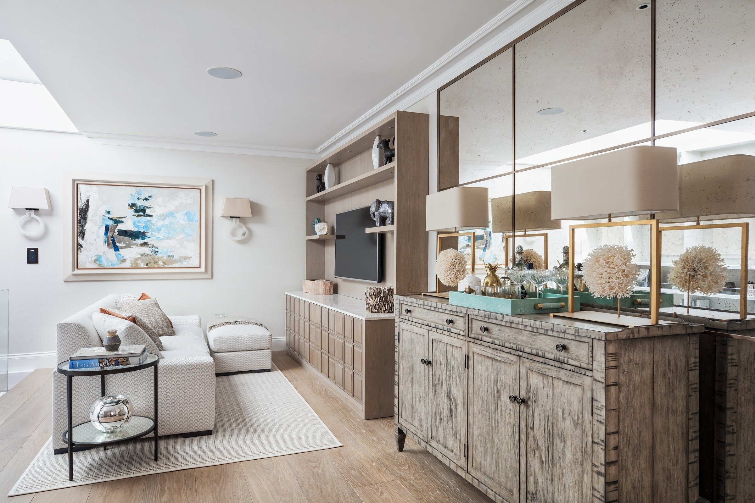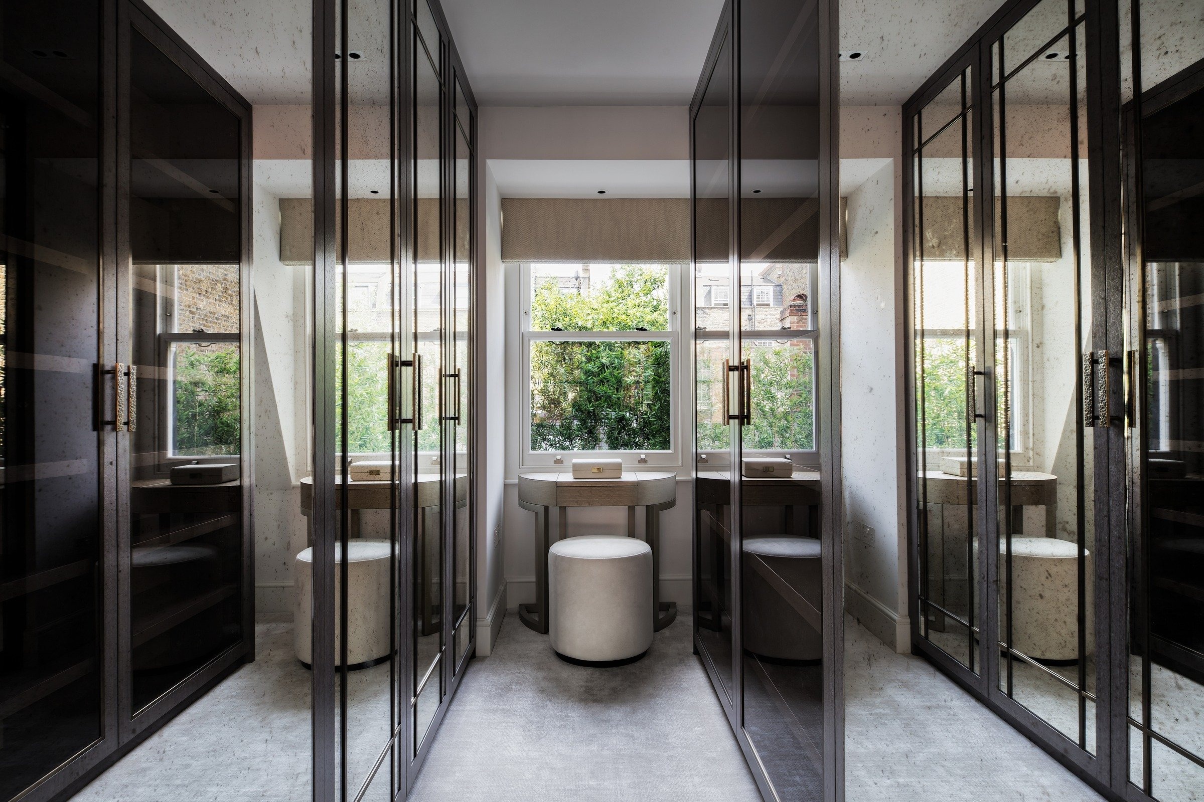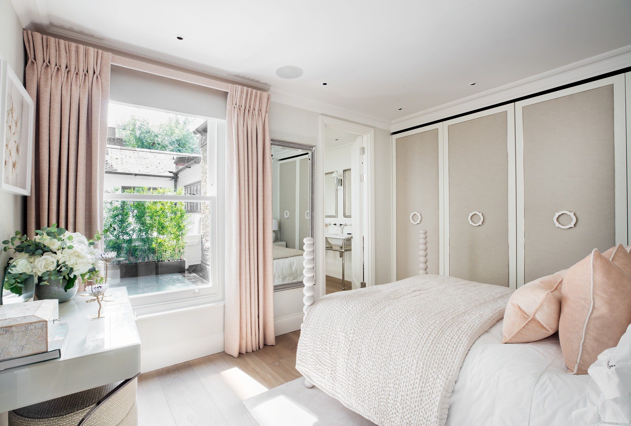 This unmodernised Georgian terraced house was transformed into a spacious family home through a basement dig-out and loft conversion, alongside a complete front façade renovation with a new pedimented doorway and lantern wall lights from Urban Electric. The entrance opens directly into the reception space, anchored by a new fireplace, Heathfield pendant, Kingcome sofas, and bespoke oak joinery including a TV unit with carved fronts and a mirrored bar area. A curved staircase with a tobacco leather handrail and linen runner connects the floors, leading to two guest bedrooms: one a twin scheme in blue with feature headboards, mirrored detailing, and an OKA chest, the other a double with a four-poster bed from Turnstyle and wardrobes with padded panel doors. Both bedrooms have ensuite marble bathrooms, complemented by a wet room in mushroom stone with bronze fittings, completing a home designed with elegance and market appeal.