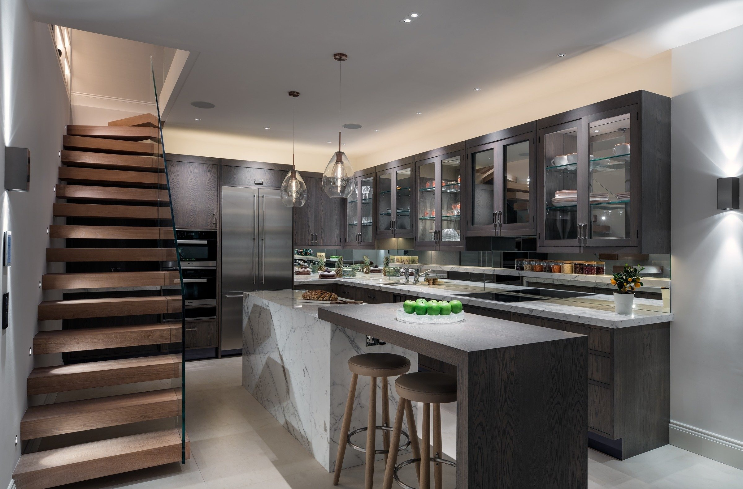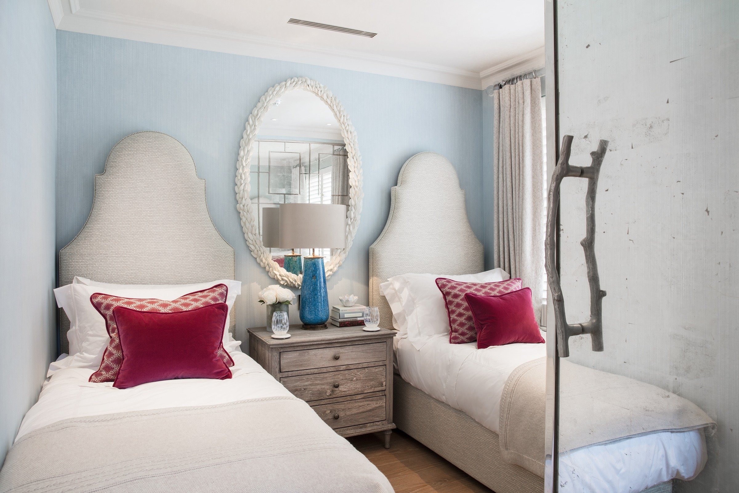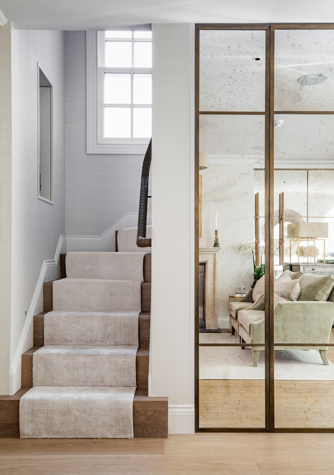 This unmodernised Georgian terraced house was transformed into a spacious family home through a basement dig-out and loft conversion, alongside a complete front façade renovation with a new pedimented doorway and lantern wall lights from Urban Electric. The entrance opens directly into the reception space, anchored by a new fireplace, Heathfield pendant, Kingcome sofas, and bespoke oak joinery including a TV unit with carved fronts and a mirrored bar area. A curved staircase with a tobacco leather handrail and linen runner connects the floors, leading to two guest bedrooms: one a twin scheme in blue with feature headboards, mirrored detailing, and an OKA chest, the other a double with a four-poster bed from Turnstyle and wardrobes with padded panel doors. Both bedrooms have ensuite marble bathrooms, complemented by a wet room in mushroom stone with bronze fittings, completing a home designed with elegance and market appeal.