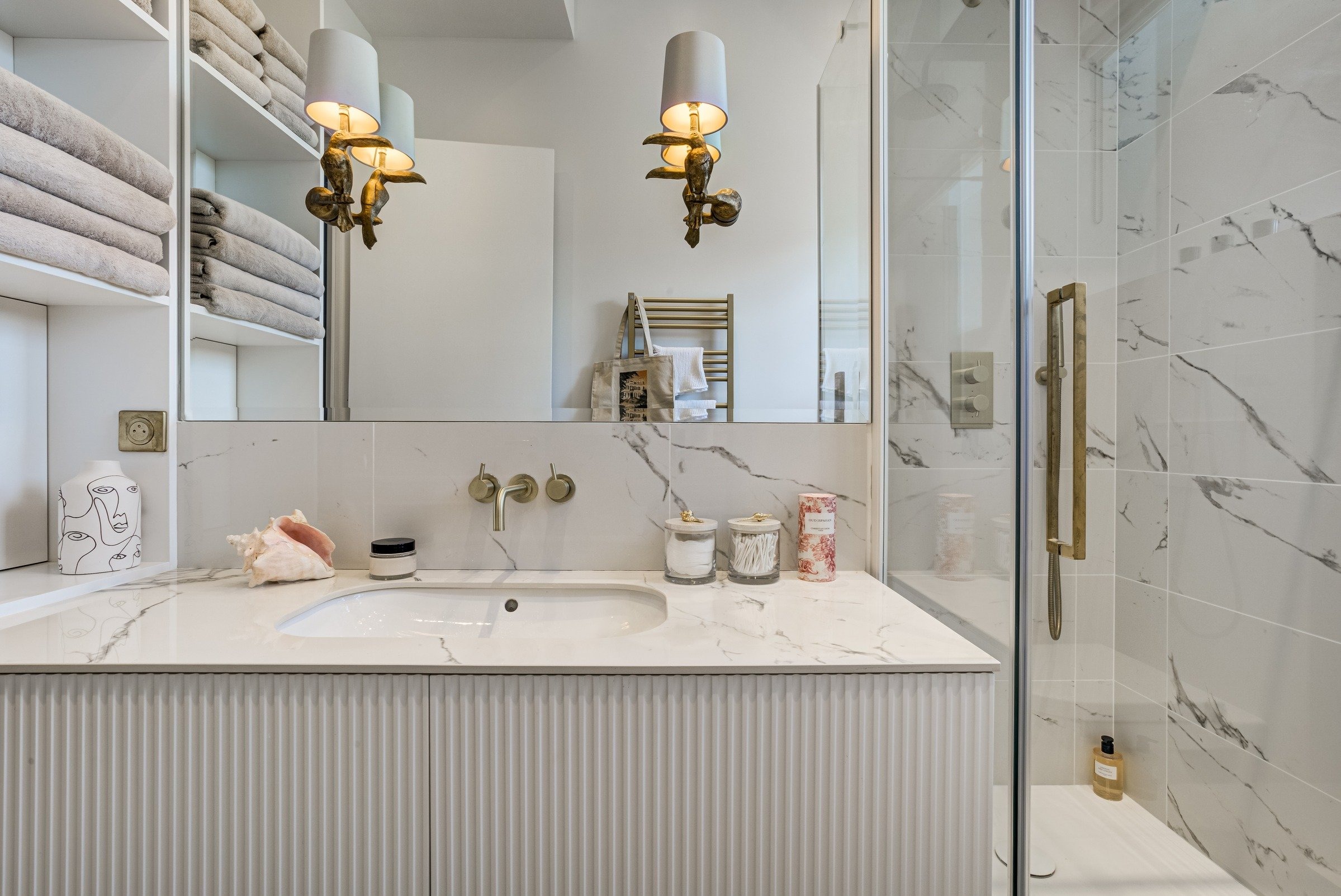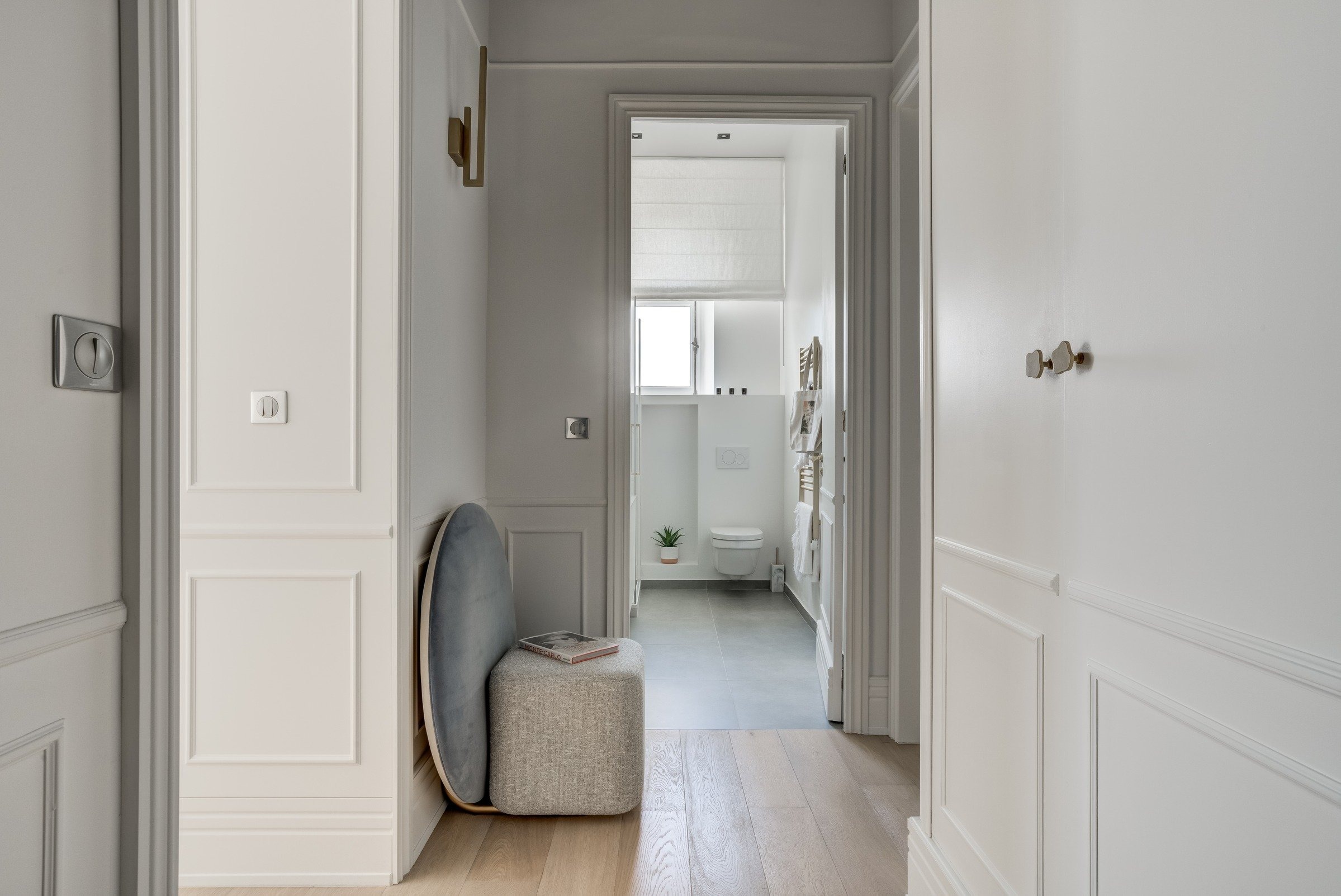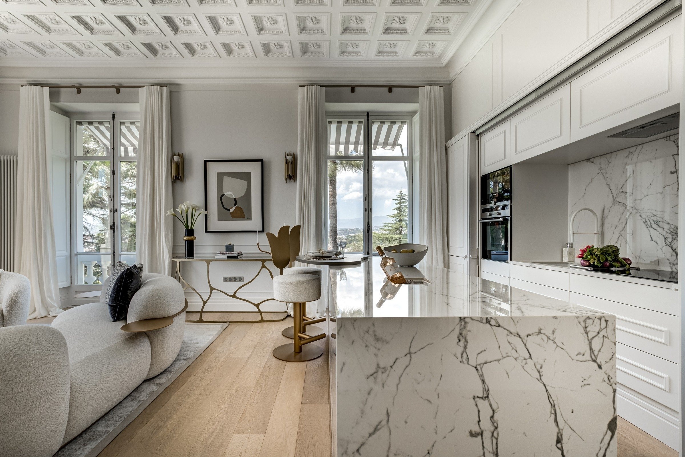 Perched above Cannes harbour within an 18th-century Classical building, this Côte d’Azur apartment was extensively renovated for our clients, a professional German couple seeking a refined pied-à-terre. Working with Monaco-based contractors Chartwell Group, we combined restored architectural detail with a contemporary interior, revitalising original coffered ceilings, walls, and floors while introducing elegant panelling and new cornices to the main rooms. The existing parquet was re-sanded and stained in a soft grey wash, creating a modern backdrop for a palette of neutrals accented with brass and copper tones. Balancing grandeur with comfort, the apartment now reflects the spirit of Cannes while offering a sophisticated retreat with spectacular views over the French Riviera.