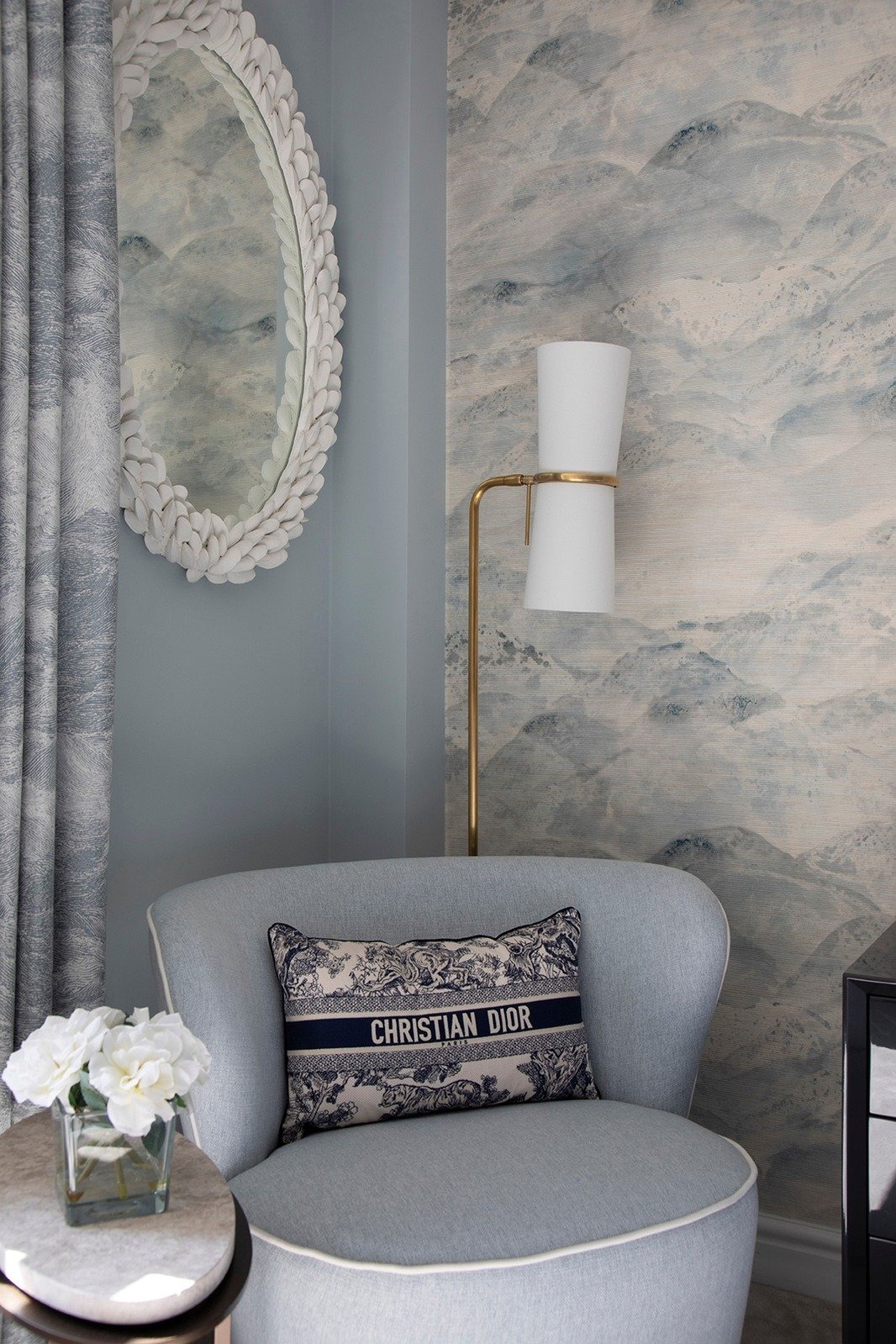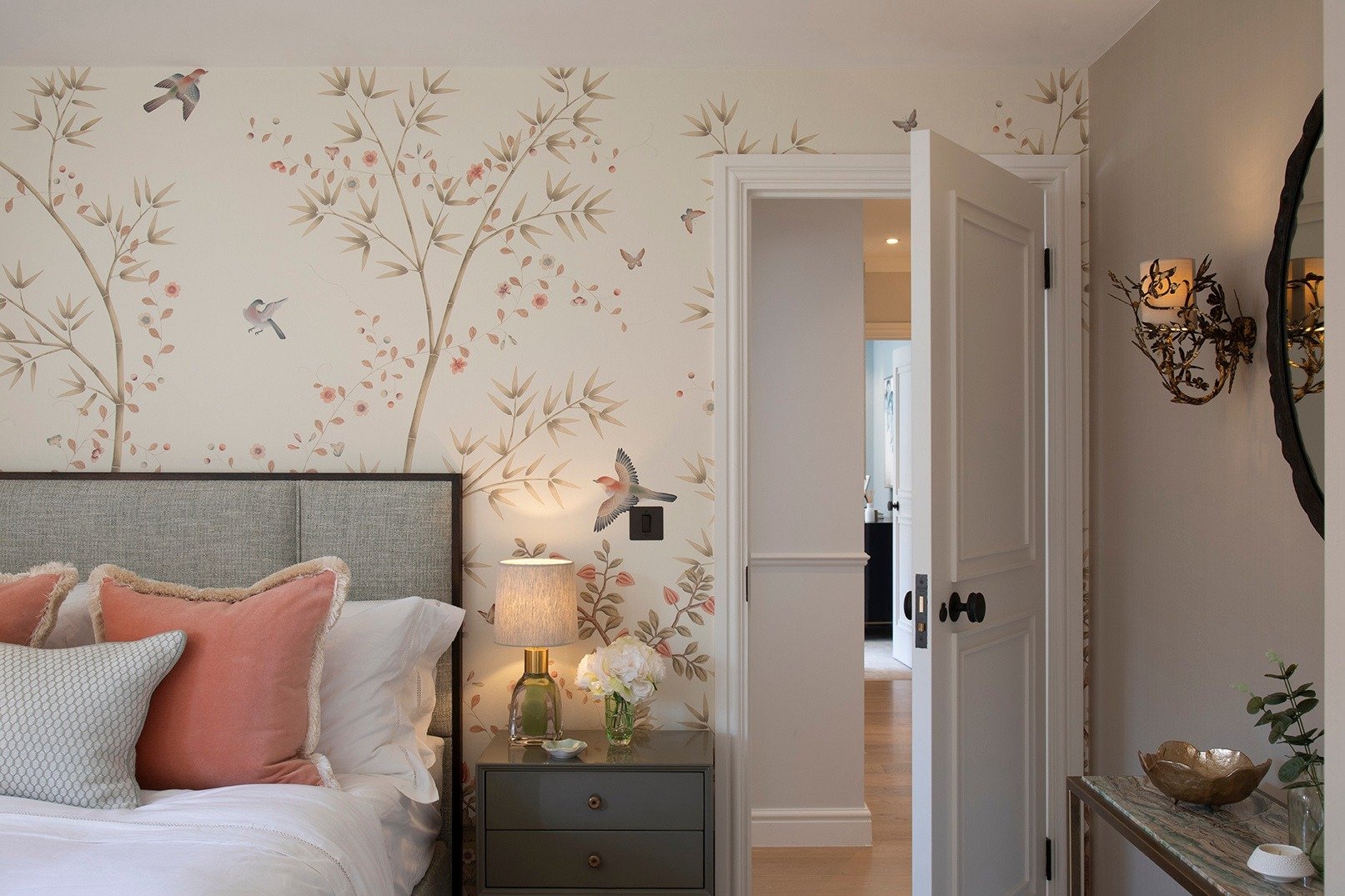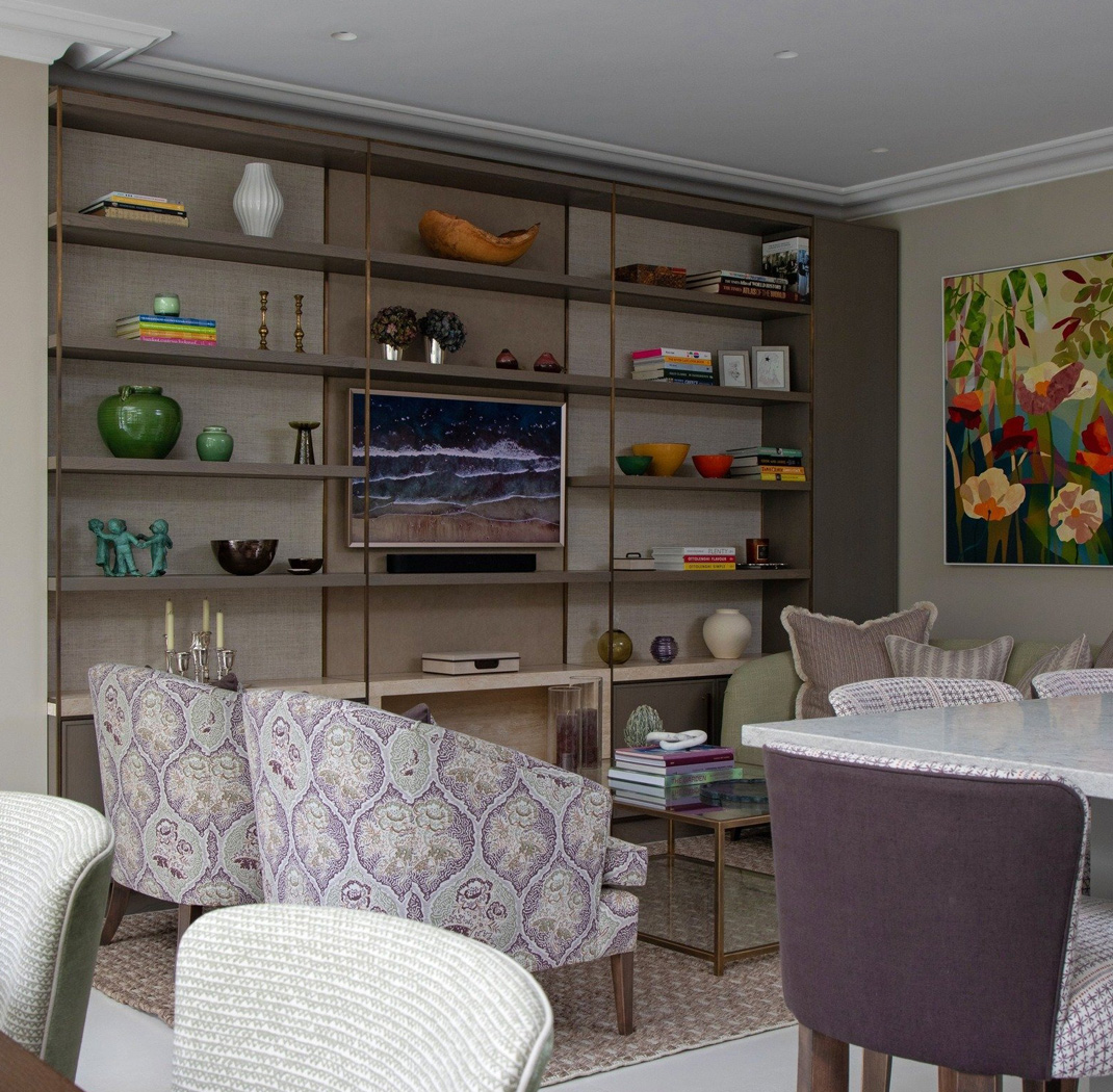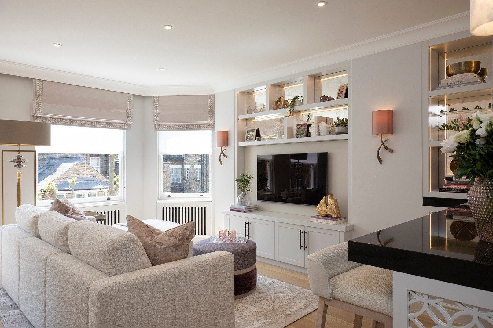 Our clients purchased this apartment as a London pied-à-terre, with the brief to transform it into a luxurious yet practical family base. The main living area was redefined into three zones: a kitchen and bar, a central seating area around bespoke joinery, and a custom banquette dining space for six, complete with integrated lighting and hand-painted Fromental silk wallpaper. Bedrooms were refreshed with new joinery, carpets, and wallpapers, while the hallway was given a classic contemporary twist with panelling, antique mirrors, and decorative wall lights. Automated blinds, new cornicing, and a turnkey finish with elegant tableware completed a space that balances comfort and sophistication.
